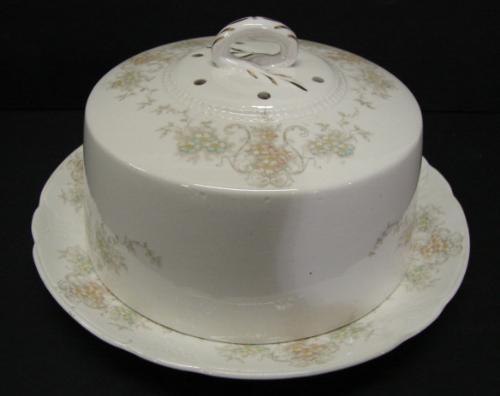 KNOWLES, TAYLOR & KNOWELS (1890) PORCELAIN PANCAKE DISH WITH LID. Transfer floral decorated. Shows some chipping at bottom edge of lid. Shows crazing throughout plate and lid. Marked on bottom. 5.25” H, 9” Dia.