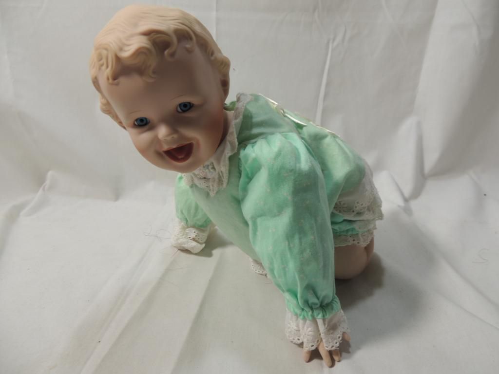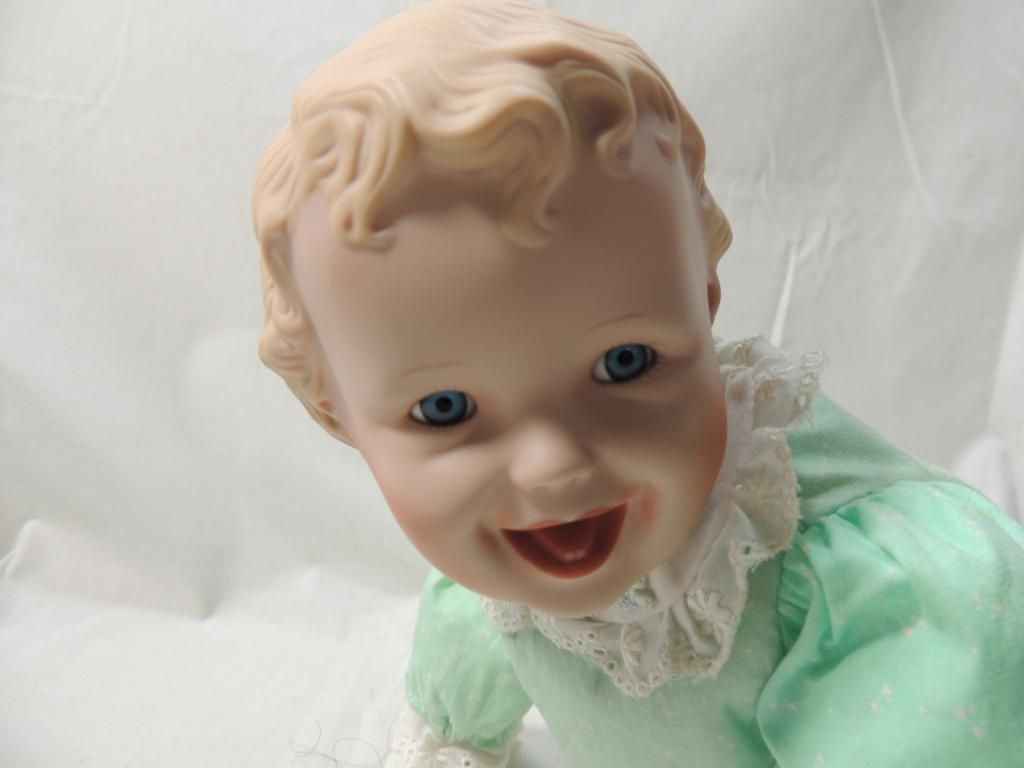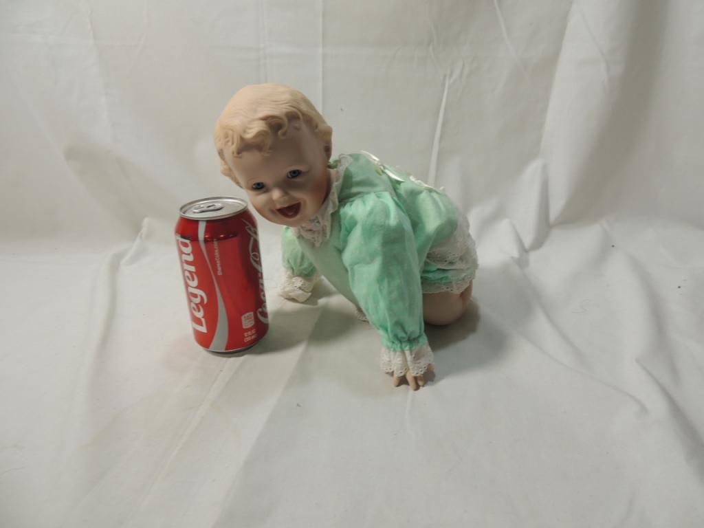 KNOWLES YOLANDA BELLO DOLL "JESSICA" PORCELAIN DOLL. 13" TALL. LIGHT GREEN DRESS AND BLUE EYES. POSED ON KNEES. AS SHOWN SEE PHOTO FOR MORE DETAILS.