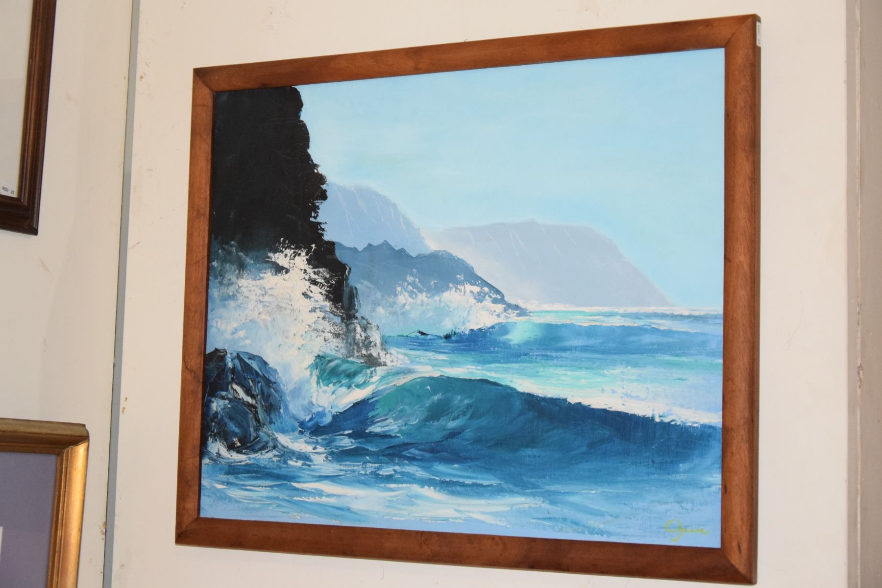 KOA FRAMED OIL ON CANVAS "NA PALI COAST, KAUA'I"; SIGNED (18" X 22")