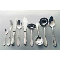KOCH & BERGFELD, Bremen Hugo Leven Besteck, Bremer Lilie, Silber. 54tlg., bestehend aus 12 Gabeln, 12 Messern, 13 Suppenlöffeln, 12 Kuchengabeln und 5 Vorlegeteilen, davon 4 plated. Spatelförmige Griffe gerahmt von einem Liniendekor, aus dem Stiel wächst eine lilienartige Blüte hervor. L.: 14 - 27 cm. Bez.: Firmenmarke, Feingehaltsmarke 800, Halbmond/Krone, auf den Plated-Vorlegeteilen: Kochberg 90. Um 1905 Lit.: Sänger, R.W., Das deutsche Silber-Besteck, 1805-1918, Stuttgart 1991, Abb. 78, S. 155