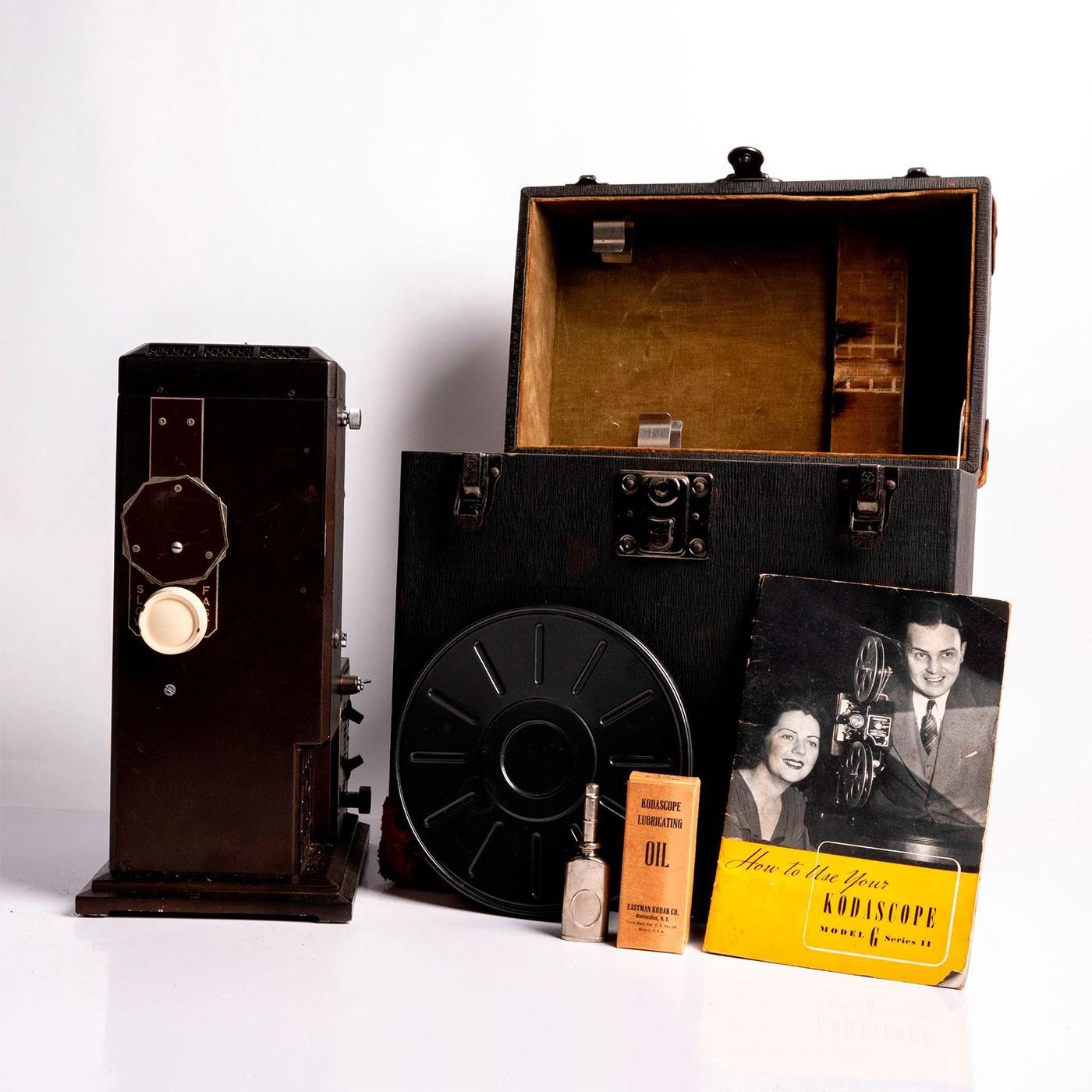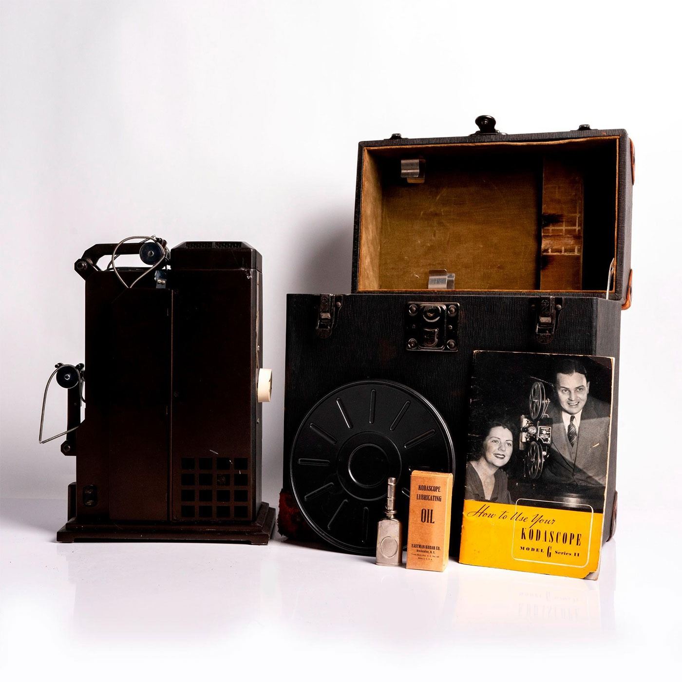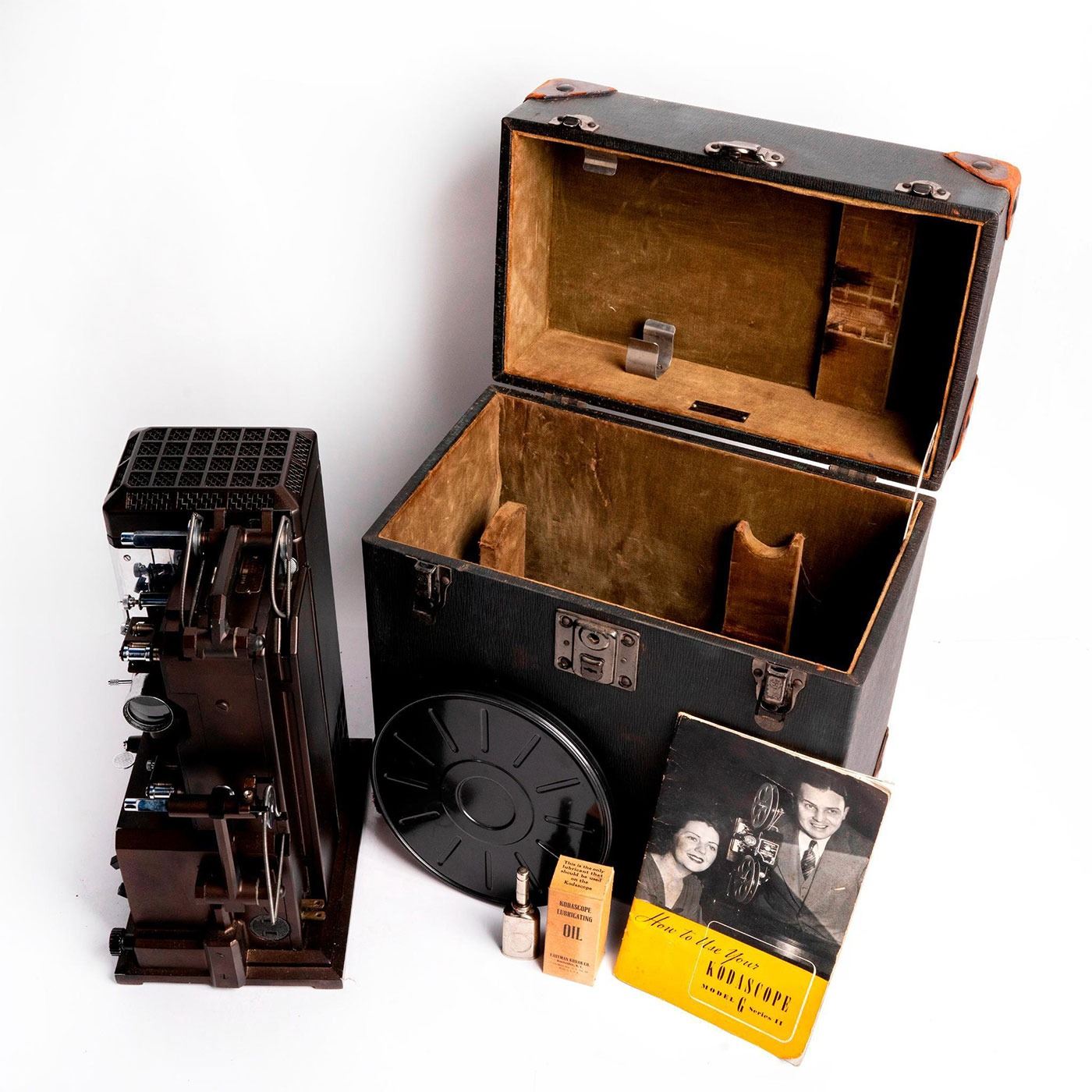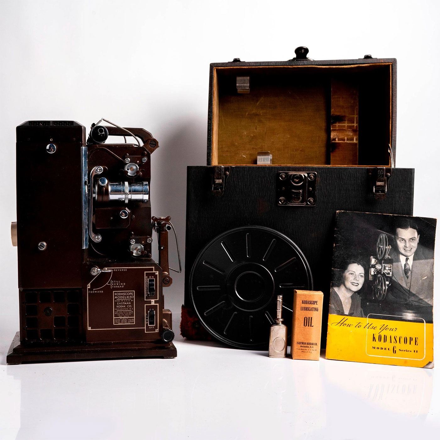 Vintage movie projector from the Kodak Company. This nice condition movie projector from the mid 20th century was produced by the famous Kodak film and camera company of Rochester New York. Complete with its carry case, reel and instruction manual this is your opportunity to own a cool piece of history. Black carry case has its origonal velvet liningbut does have some age wear on the outside. Projector is in very good condition and the manual is in good condition with only age related wear, no tears or missing pages.Lion and unicorn does not gurantee the working order of mechanicle pieces, clocks or other electronic items. Cameras and Photographica