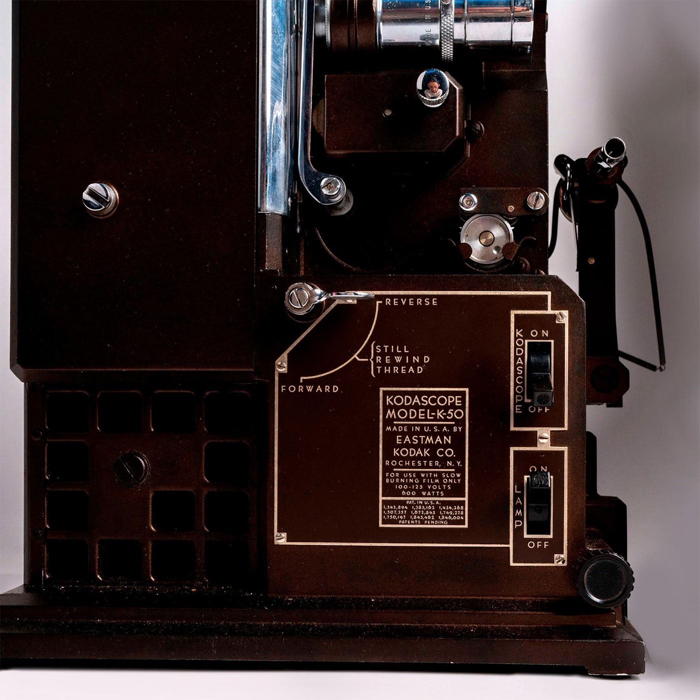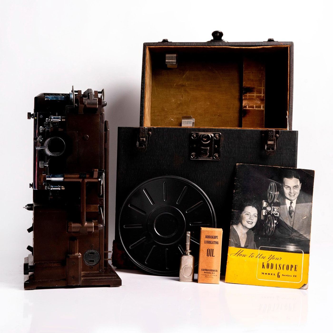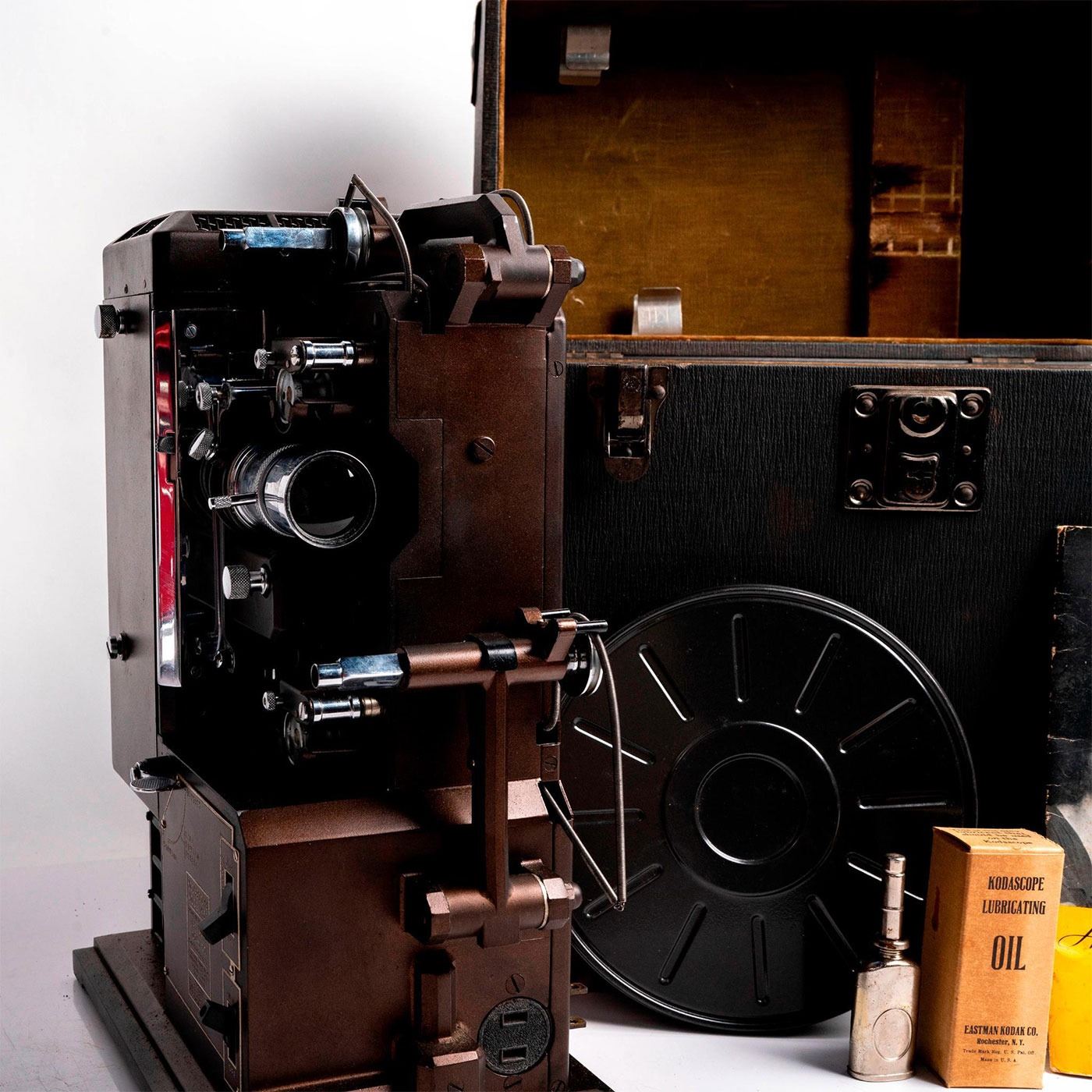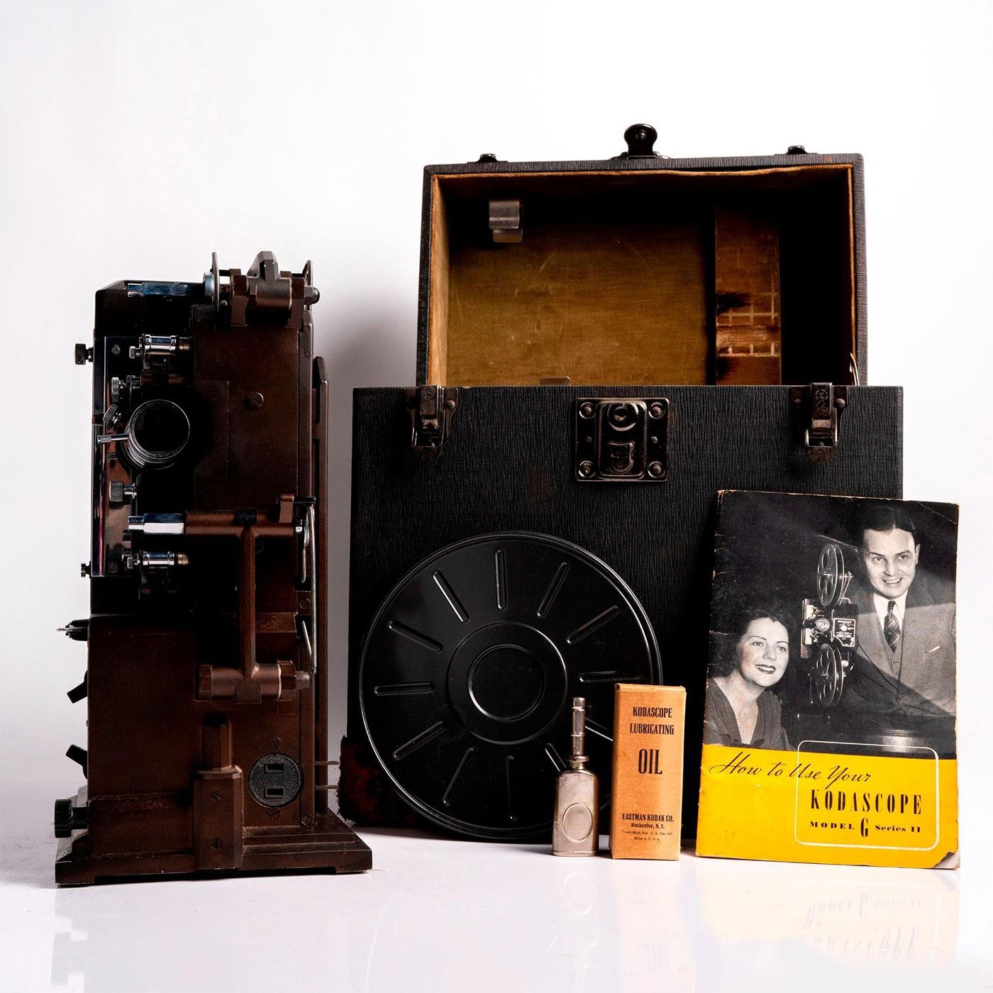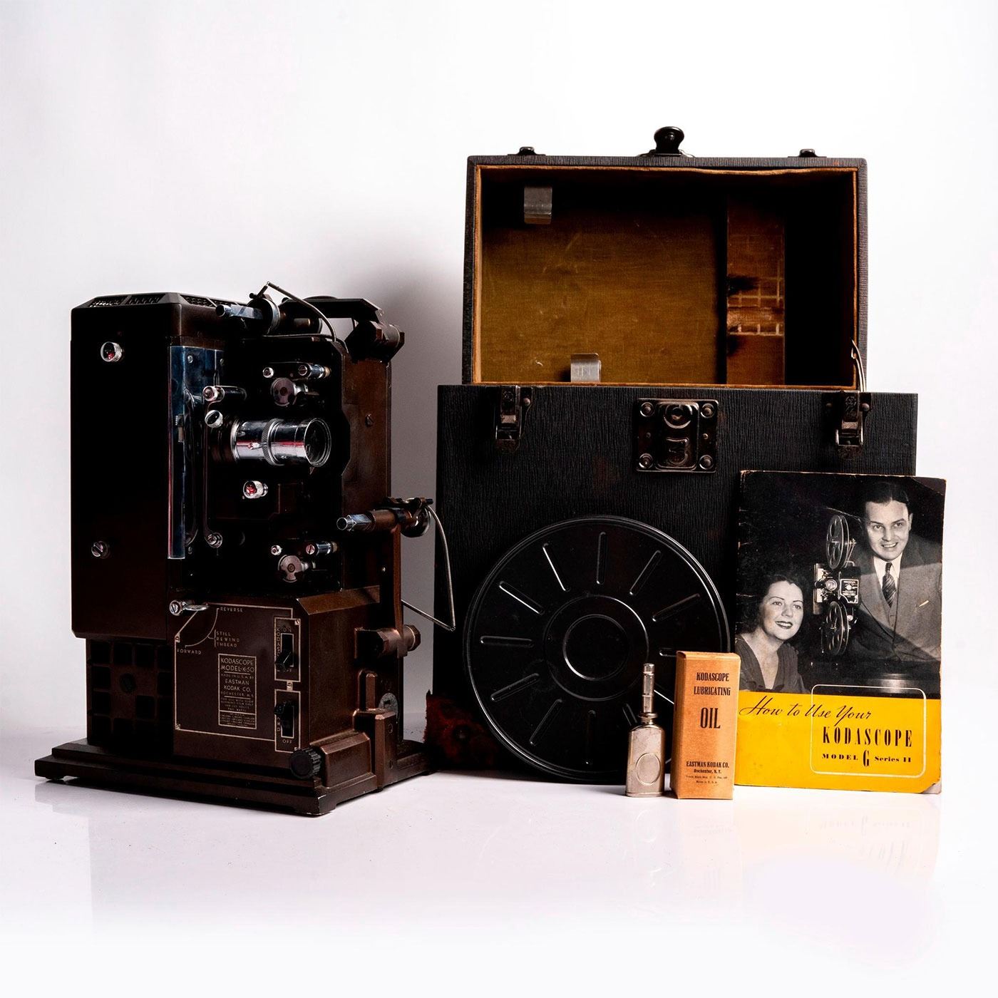 Vintage movie projector from the Kodak Company. This nice condition movie projector from the mid 20th century was produced by the famous Kodak film and camera company of Rochester New York. Complete with its carry case, reel and instruction manual this is your opportunity to own a cool piece of history. Black carry case has its origonal velvet liningbut does have some age wear on the outside. Projector is in very good condition and the manual is in good condition with only age related wear, no tears or missing pages.Lion and unicorn does not gurantee the working order of mechanicle pieces, clocks or other electronic items. Cameras and Photographica