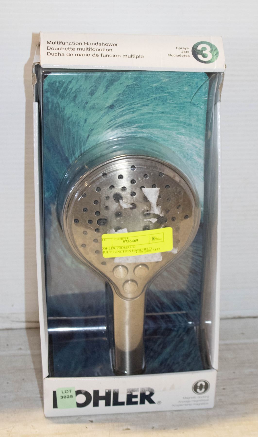 KOHLERÿPROSECCO MULTIFUNCTIONAL 1.75 GPM HANDSHOWER HAS THREE SPRAYS TO CHOOSE FROM. THE HANDSHOWER FEATURES THE DOCKNETIK? MAGNETIC DOCKING SYSTEM TO SECURELY LOCK IT INTO PLACE.
