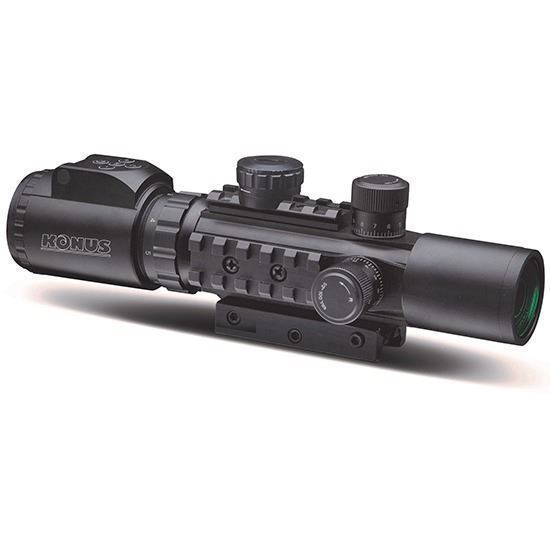 The Konus Pro AS34 has been constructed with quick target acquiring properties. Thus, speed and accuracy have both been enhanced whether at the range or in Close Quarter Battle (CQB) situations. A beffy outer diameter of 34mm can withstand the most extreme conditions. An integrated tri-rail accepts all your accessories. Completely waterproof with a dual illuminated, etched mil-dot reticle for low light shooting, and a wide angle field of view for fast moving targets. The included base will mount on weaver or picatinny rails, as well as a 3/8" dovetail rail.