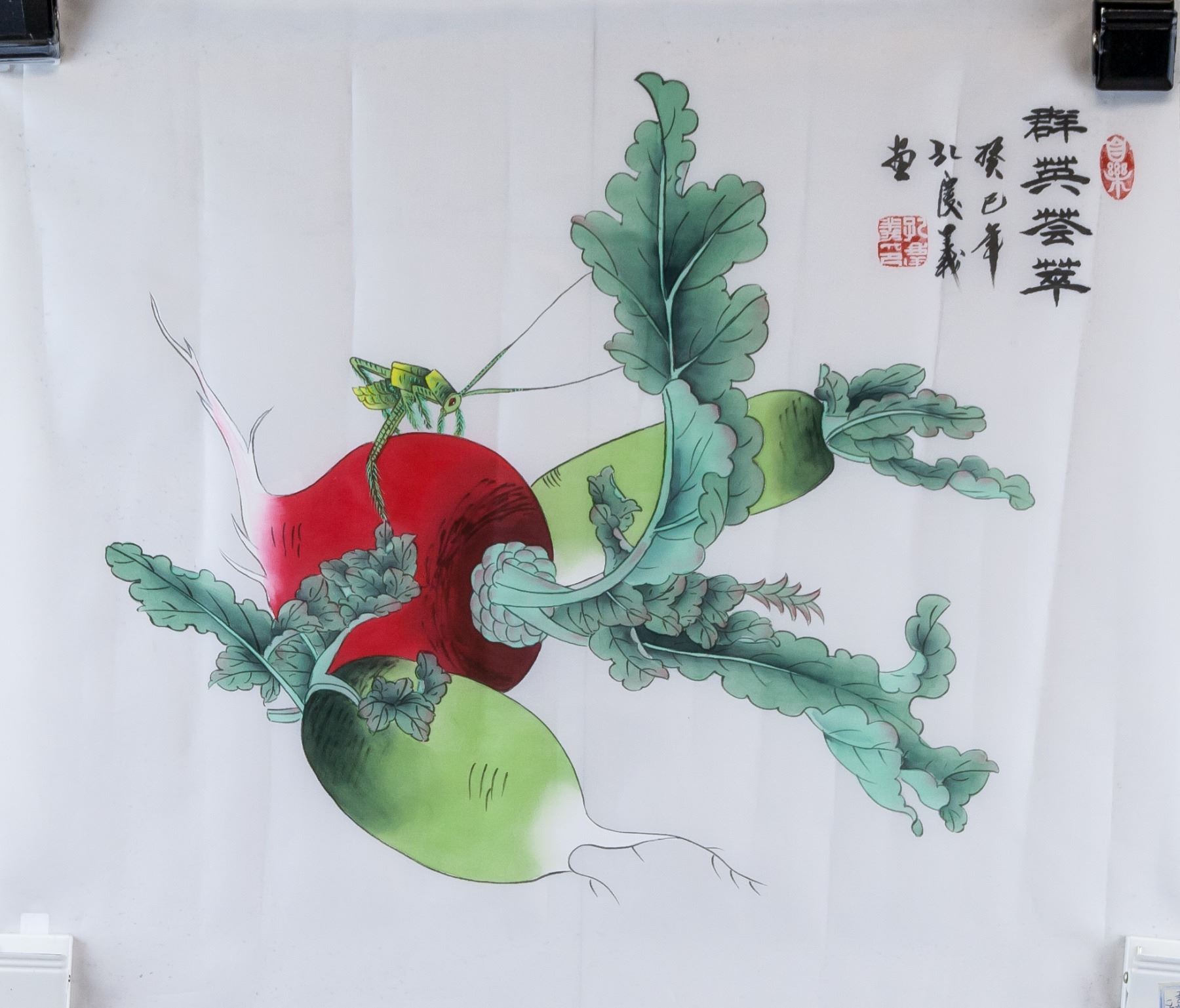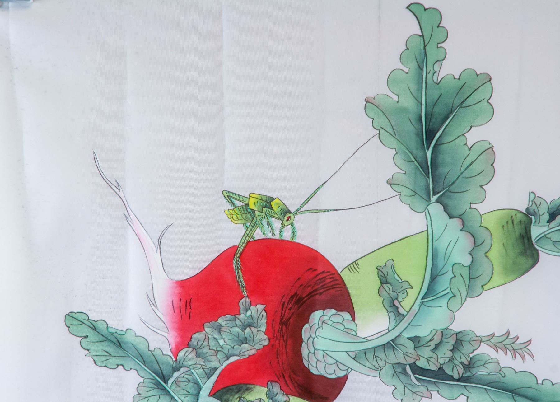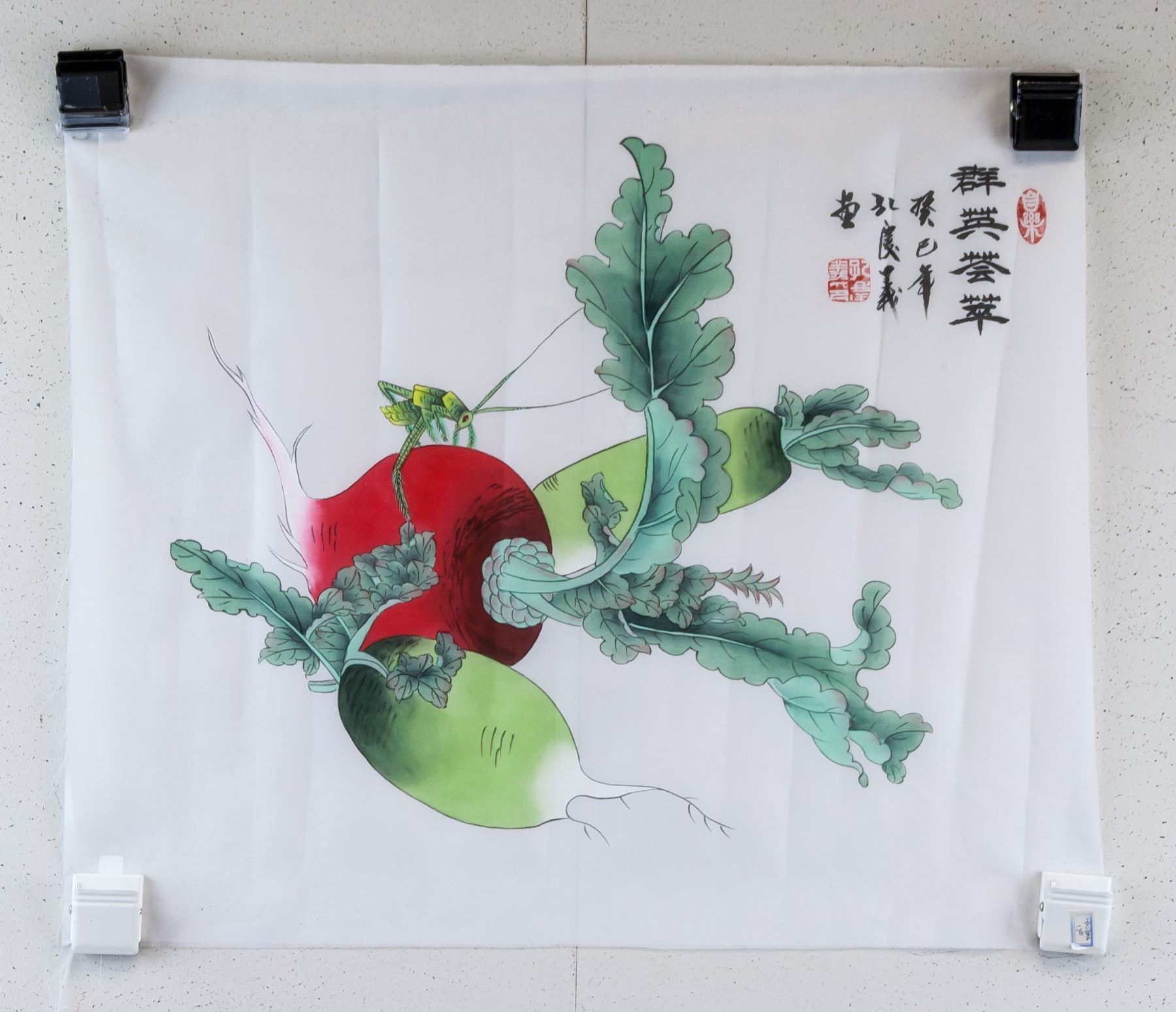 Watercolor and ink on silk, featuring radish, signed Kong Qingyi (Chinese, b.1947), inscribed with 2 artist seals, 47 x 55 cm. Kong Qingyi is a visual artist. Several works by the artist have been sold at auction, including 'Radish' sold at 888 Auctions 'Chinese & Asian Art' in 2015.