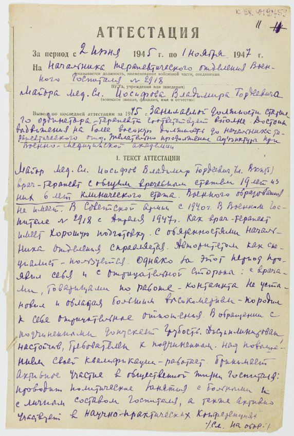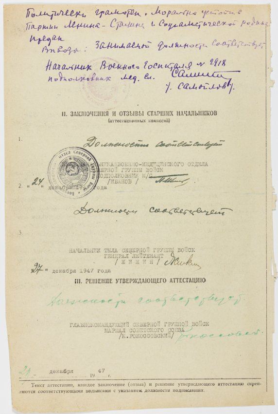 (1896 - 1968) Soviet general who held the critical northwest approaches to Moscow, later headed defenses at Stalingrad and near the end of the war encircled and destroyed the German 4th Army. Manuscript D.S., 2pp. large 4to., [n.p..], 1947, his attestation as to the competency of a member of a military hospital, signed as "Commander of the Northern Group". Very good.