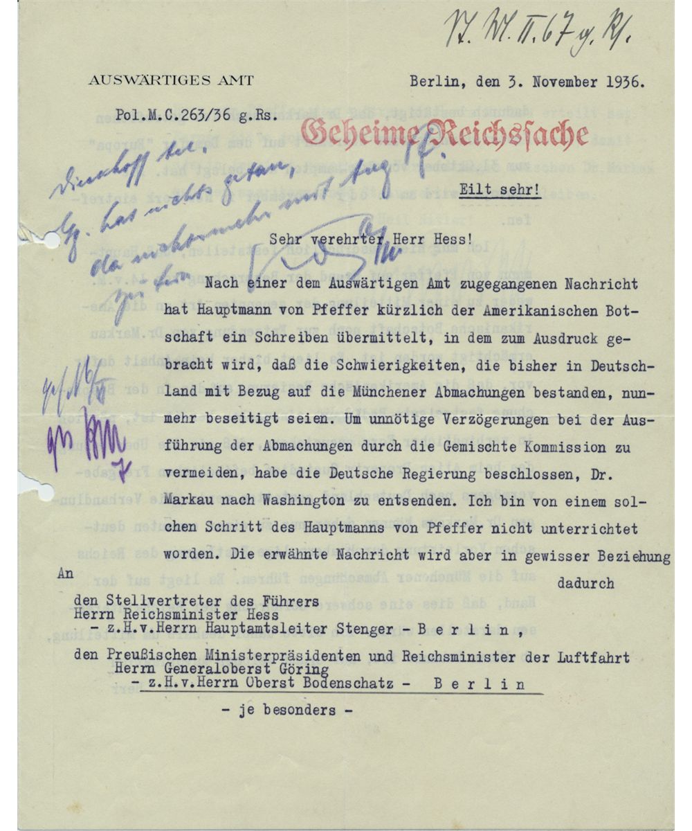 (1873 - 1956) Nazi diplomat and Hitler's advisor on foreign affairs. Later served as Reich Protector of Bohemia and Moravia. Sentenced to 15 years at Nuremberg. Scarce T.L.S. on official letterhead as Minister of Foreign Affairs, 3pp. large 4to., Berlin, Nov. 3, 1936 to RUDOLF HESS with a copy to HERMANN GOERING, stamped "SECRET REICHS MATTER". In part: "...The Foreign Office has recently received news that Hauptmann von Pfeffer recently sent a note to the American Embassy in which he expressed the difficulties which recently existed in Germany regarding the Munich Agreement are now eliminated...the German Government decided that in order to avoid unnecessary delays...they would send Dr. Markau to Washington...I was not informed of this step by Hauptmann Pfeffer but the mentioned information is being confirmed...Pfeffer was not authorized to send any information to the American Embassy nor to dispatch Dr. Markau. There is no reason to expect that the American government is ready to agree to the conditions...the negotiations...will only open up renewed [difficulties]...". File holes, else very good. Von Neurath refers to the efforts of the Mixed Claims Commission which sought to obtain reparations for the U.S. for the Kingsland and Black Tom Island munitions plants sabotaged by German agents during World War I. On the previous July 6, both parties reached an agreement; and von Pfeffer signed the accord for Germany, presumably with the full authorization of his government. This document is known as the Munich Agreement. Ultimately, many of the claimants distrusted the Germans' ability to pay the claims awarded and American courts threw out the agreement. It would be the 1950s before a final ($50 million) award was made.