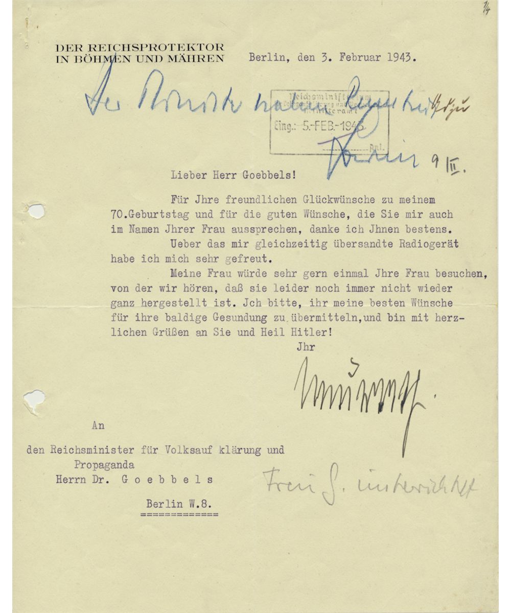 (1873 - 1956) Nazi diplomat and Hitler's advisor on foreign affairs. Later served as Reich Protector of Bohemia and Moravia. Sentenced to 15 years at Nuremberg. Scarce war-date T.L.S. on official letterhead as Reichsprotektor of Bohemia and Moravia, 1p. 4to., Berlin, Feb. 3, 1943 to Minister of Propaganda JOSEPH GOEBBELS. In part: "...Thank you for your friendly wishes for my seventieth birthday and the good wishes from your wife...I was very happy about the radio you sent at the same time. My wife would like to visit your wife as we hear she hasn't yet fully recuperated...". File holes at left margin, dockets, else very good.