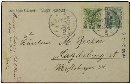 1905 Postcard with black & white view of the "The New Palace / Seol" (sic) written from CHEMULPO by Sailor on board SMS Hansa, franked by Korea 1 ch. green and Germany 5 pf. green cancelled by KAIS. DEUTSCHE / MARINE SCHIFFSPOST datestamps.