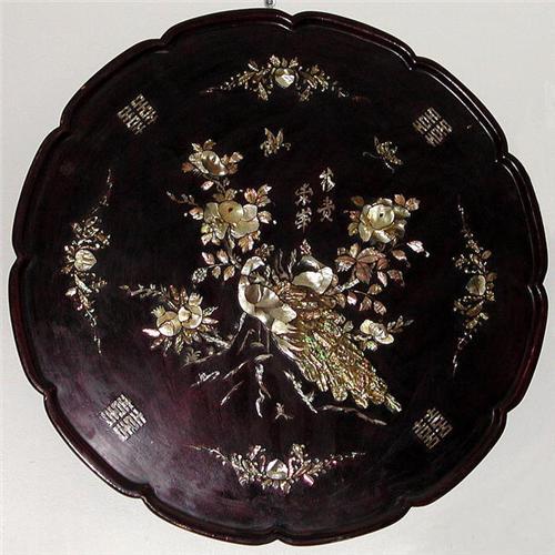KOREAN INLAID MOTHER-OF-PEARL LOW TABLE OR WALL PLAQUE<p>An unusual and attractive low table from Korea. Extensive inlaid mother-of-pearl on the surface of this highly decorative piece forms an exquisite painting, depicting a peacock, flower blossoms, leaves, pomegranates, butterflies and laurels. The pomegranate is a symbol of favorable influence and would symbolize, for example, the hope of a family for numerous offspring behaving in a virtuous and filial manner and rising to fame and glory. The butterfly is an emblem of joy, finding great happiness in flitting about sipping nectar from numerous flowers. It is also a symbol of summer and conjugal felicity, and is sometimes depicted like an Asian cupid. <p>The artist's signature or inscription lies between the butterflies, and the four inlaid calligraphy characters around the inner border appear to signify double happiness for the owner of this piece. The legs fold under the table top with thumb screws, thus transforming the table into a beautiful circular piece nearly three feet in diameter, framed by a scalloped border, which can be hung as a wall painting or decoration (see photos: in the first photo it hangs on a wall, and is shown here closest to its actual color. The other photo colors vary somewhat, showing more red due to bright lighting). Condition of this piece is very good to excellent; the dark, reddish-brown patina is attractive ...