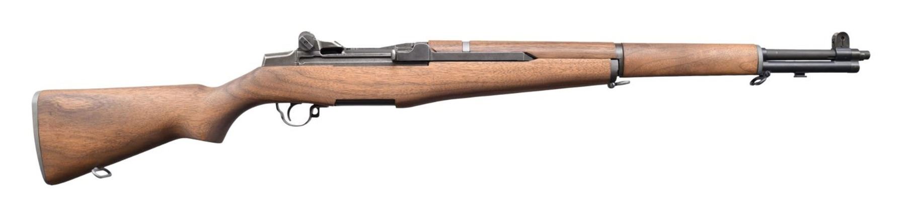 SEMI-AUTO MILITARY RIFLE. Cal. 30-06. S# 4522785. Bbl. 24" marked on right side "SA 2-55". Throat & muzzle gauge less than 1.0. Locking bar rear sight w/ battle range elevation knob. Replacement blade front sight w/ protective ears. Bolt, operating rod and trigger group are marked "SA". Walnut stock set is modern replacement. Stock is dated in bbl. channel "APR 11 2014" & has penciled "B". Stock has boxed defense acceptance eagle replicated on left side. CONDITION: stock set has very nice appearance w/ light wear and tiny handling marks. Metal parts except bbl. and gas cylinder have a well worn thinning, original parkerized finish. Bbl. and gas cylinder have a much larger degree of dark parkerization. Very good shiny bore. (24-1628 /RW). CURIO. $1,000-1,500.