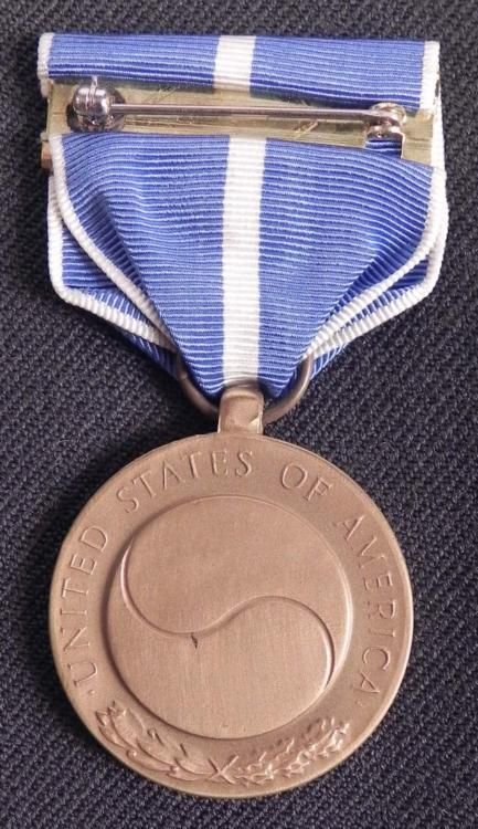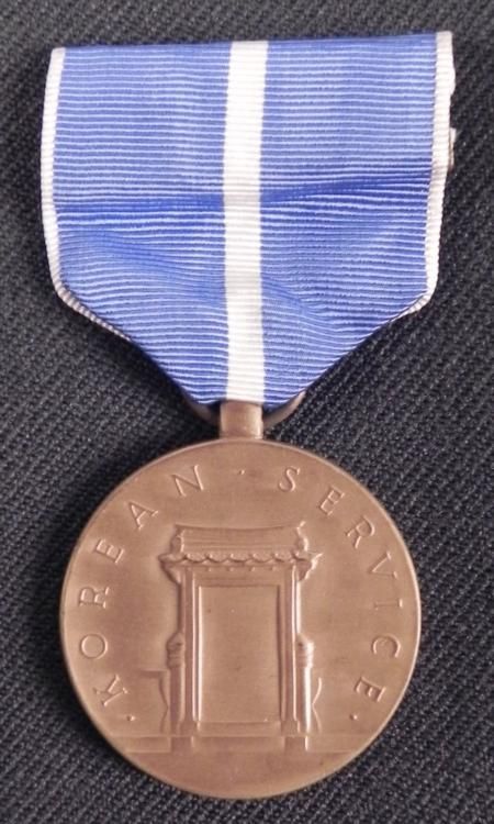 KOREAN WAR SERVICE AWARD MEDAL ON RIBBON-PERIOD PIECE * BLUE/WHITE STRIPED RIBBON-PIN BACK *