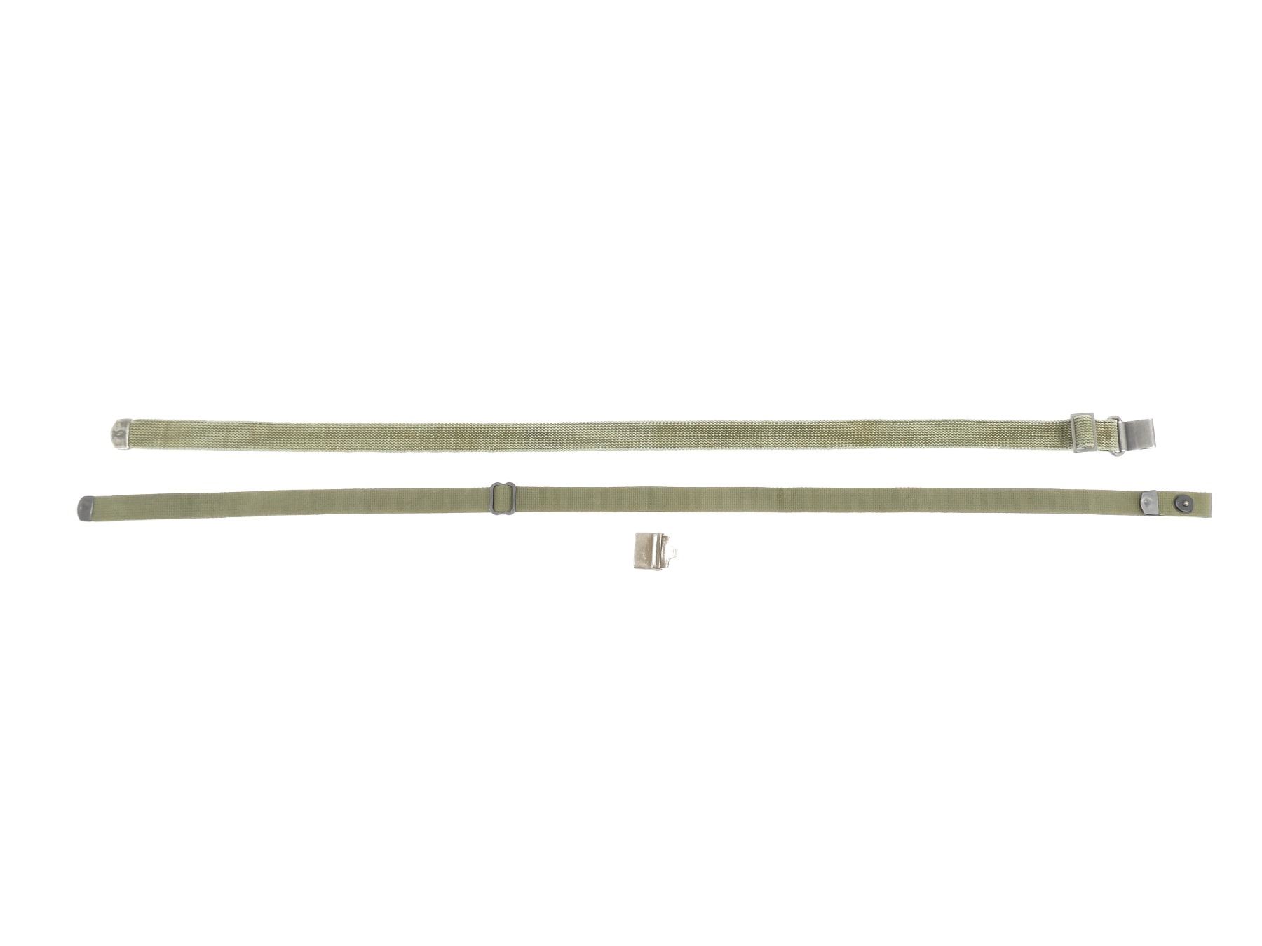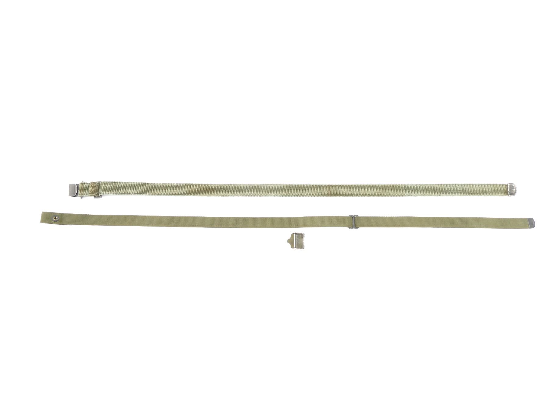LOT INCLUDES; (1) M1 GARAND .30-06 SPRINGFIELD RIFLE SLING, GREEN CANVAS WITH STEEL FITTINGS, NO VISIBLE MARKINGS, OAL APPROX. 40.25", ADJUSTABLE & (1) M1 / M2 .30 CARBINE SLING, GREEN CANVAS WITH BLACK PAINTED METAL FITTINGS, NO VISIBLE MARKINGS, OAL APPROX. 47.75", ADJUSTABLE. SEE PHOTOS.