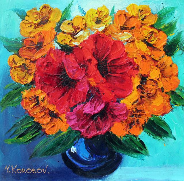 KOROBOV FLOWERS IN BLUE VASE ACRYLIC. Artist: Yana Korobov (b. 1972) - Title: FLOWERS IN BLUE VASE - Medium: Original Acrylic on Canvas - Signature: This one-of-a-kind work is hand-signed by the artist at the bottom of the image - Image Size: Approximately 16 inches x 16 inches - Framed: Unframed on Unstretched Canvas - Biography: Yana Korobov was born in the Ukraine in 1972. She studied at her local High School of the Arts in Kharkiv. She then went on to study at the Art & Industry College and the Sloboda State University in Kharkiv. - She graduated as an art teacher from the State Art College in Kharkiv. In 2003 she immigrated to Israel. She is a young and upcoming artist whose work has been admired worldwide. Her artwork has recently been exhibited in Israel, the United Stated and Europe. - Warranty: Item GUARANTEED to be as described