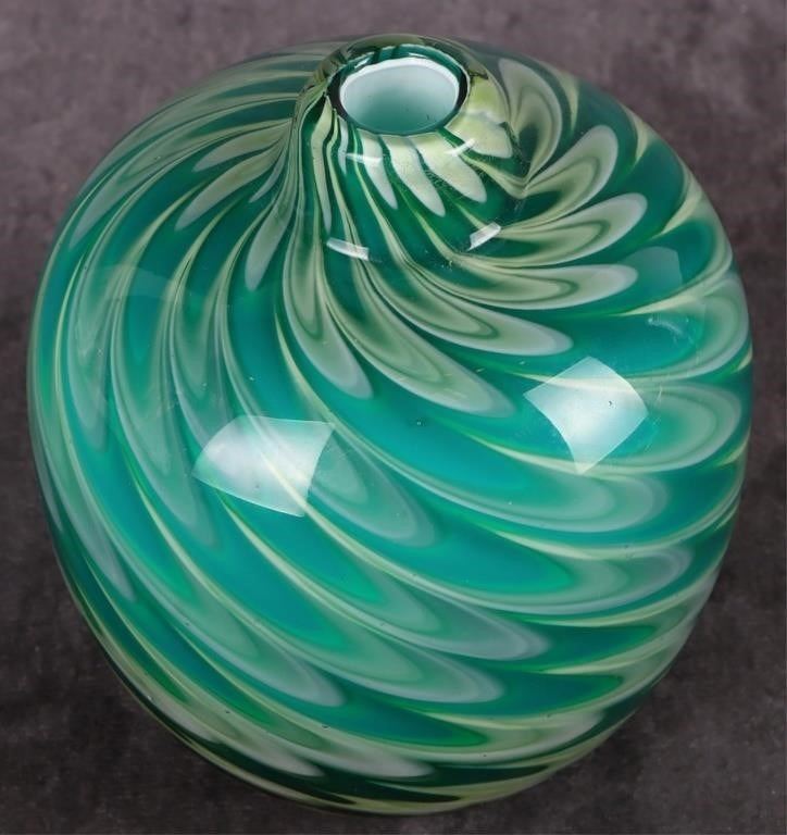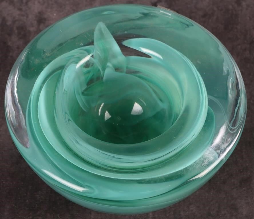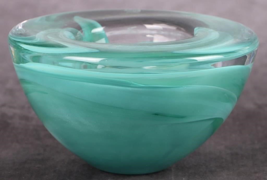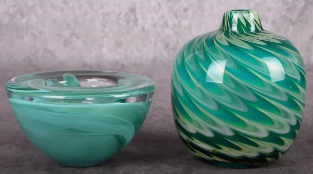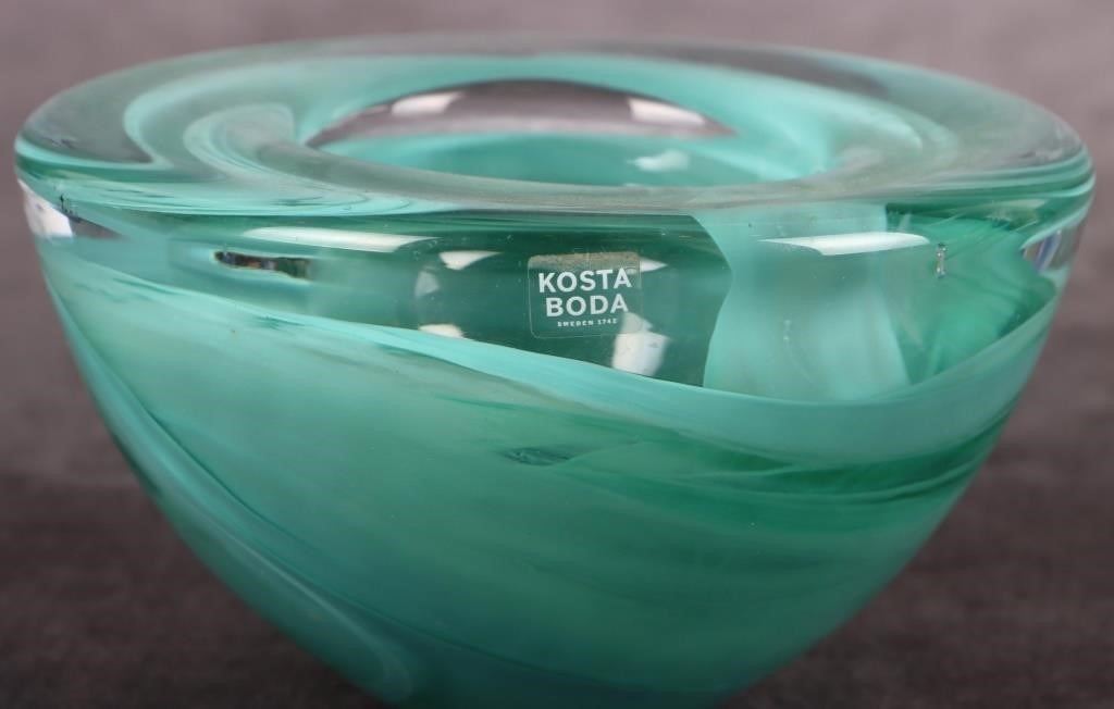 Kosta Boda Sweden blue glass art glass bowl and one hand-blown blue feathered unsigned art glass vase.