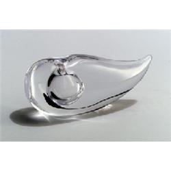 farbloses Glas mit schwarzem Glasfaden. Massives Glas in Fischform mit eingeschossener Blase. Im unteren Bereich ein schwarzer sich verdickender Glasfaden. L.: 21 cm. Bez: Kosta Unika 598 D. Um 1959