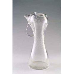 KOSTA GLASBRUK AB, Ekeberga Vicke Lindstrand Vase, farbloses Glas. Wandung mit sandstrahlgraviertem Dekor aus sich kreuzenden Linien mit Punkten. Stilisierte Form eines Hahnenkopfes mit langem Hals, kreisförmige Mündungsöffnung, weitere Öffnung durch abgeschnittenes Schabelende. H.: 28 cm. Bez.: Kosta LG 282 (sandstrahlgraviert). 1950er Jahre