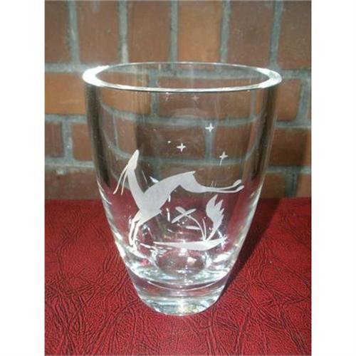 WE PRESENT TO YOU A KOSTA BODA/ORREFORS WHEEL CUT AND FROSTED LEAPING GAZELLE CRYSTAL VASE. OVOID BODY,MOVING TO A ROUNDED RECTANGULAR TOP AND RIM. WITH A HEAVY THICK BOTTOM,MEASURING 5.0" TALL,4.0" DEEP, 3.00" WIDE, AND WITH A BASE 2" DIA. AND MOUTH AT 3.0" DIAMETER ON ONE SIDE AND 3.75" DIA. ON THE OTHER SIDE. THIS IS A COLLECTORS PIECE OF ART, IT WILL CONTINUE TO ESCALATE IN VALUE. INVEST IN ART GLASS FOR YOUR FAMILY AND LOVED ONES.EXCEPTIONALLY CLEAR BLANK, HAND BLOWN.
