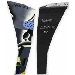 <b>1247. MARK KOSTABI</b> (b. 1960) American impressionist artist and illustrator, his works have been placed in collections at the Guggenheim, Metropolitan Museum of Art and the Museum of Modern Art. A neat Kostabi item, a remnant of an original painted canvas and nearly complete in itself, measuring approximately 13" tall x 5" wide across the top, and showing one of Kostabi's well-known silhouette figures in a gray setting. Boldly signed at top "<i>Kostabi 1998</i>" and again on verso "<i>Kostabi Remnant II 1998</i>". Irregularly trimmed, very good condition, ideal for display.<b>$500-700</b>