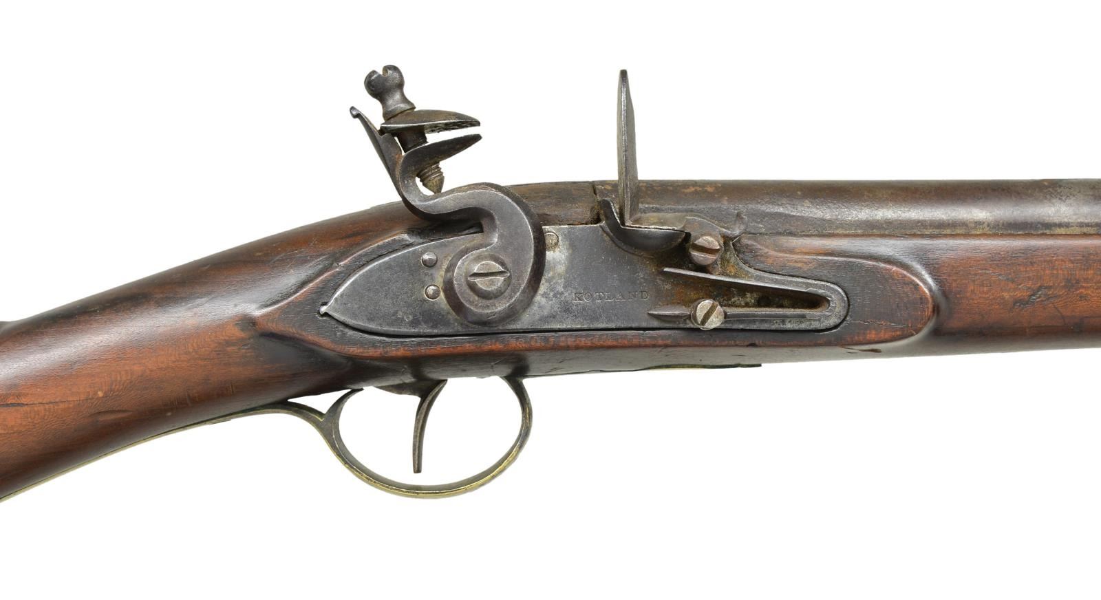 Cal. About 73. NSN. Bbl. 42". Brass blade front sight, KOTLAND marked lock, no visible markings on Bbl. Brass tipped near full length one piece walnut stock w/ brass furniture to include buttplate, trigger guard, two sideplates, stock cap & 3 pipes that secure a tulip shaped ramrod. Appears to remain in original flint configuration & circa 1780 to 1810; possibly American. UNATTACHED ACCESSORIES: Unmarked socket bayonet w/ 14 1/2" blade & stress crack on mortise. CONDITION: Metal is primarily a gun metal gray patina w/ light pitting & some spots of rust. Lock has some trace of an older reblue. Muzzle of Bbl. shows light damage. Stock has numerous dings & dents w/ age cracks at the butt. Bore is dusty & shows light rust.