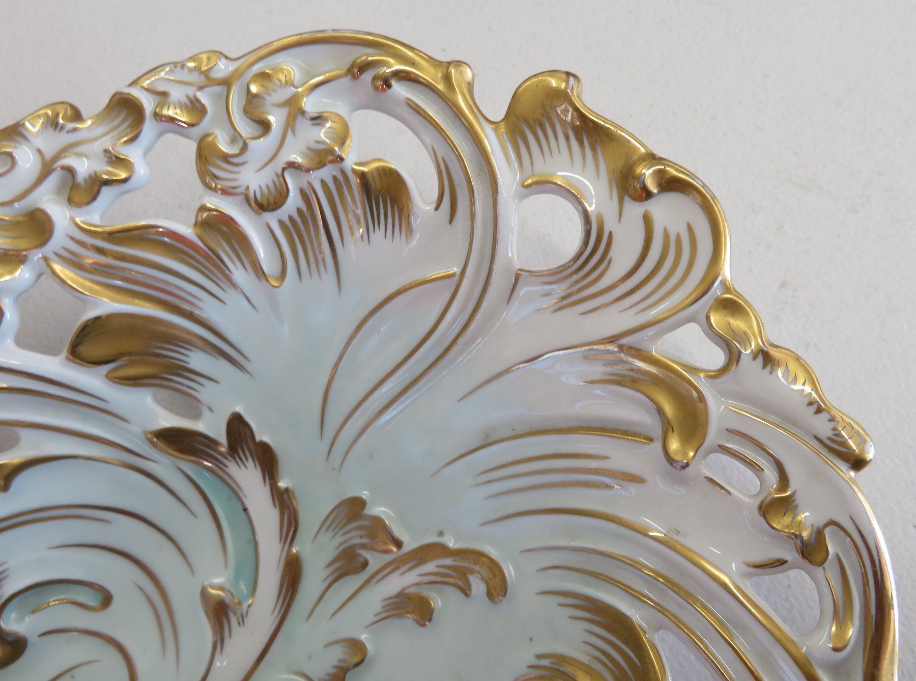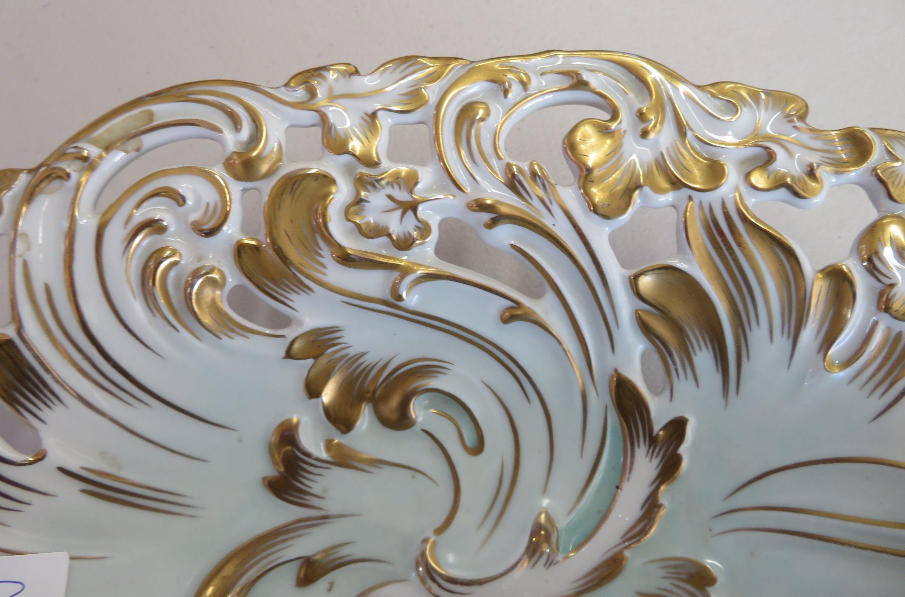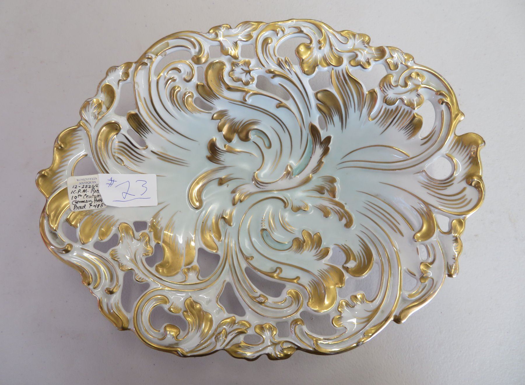 KPM German Bowl, 19th Century-Rococo. Made of gilded porcelain, the item measures 12" x 9" x 2 1/2". Germany. Condition: Good, see images. Shipping: $45.00 USA estimate only, w/insurance and signature.