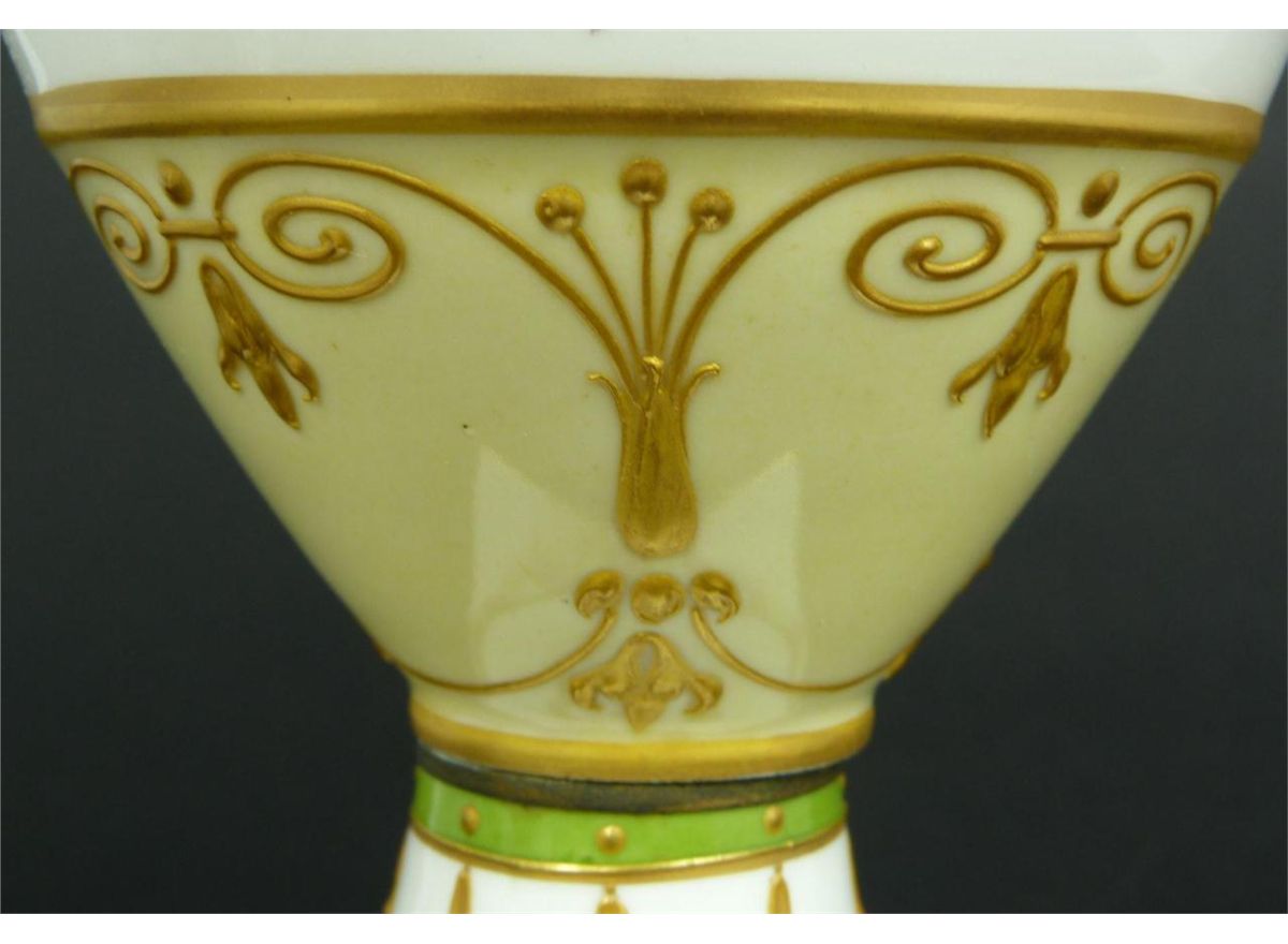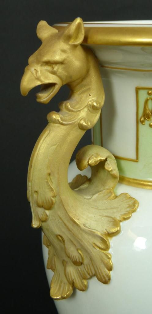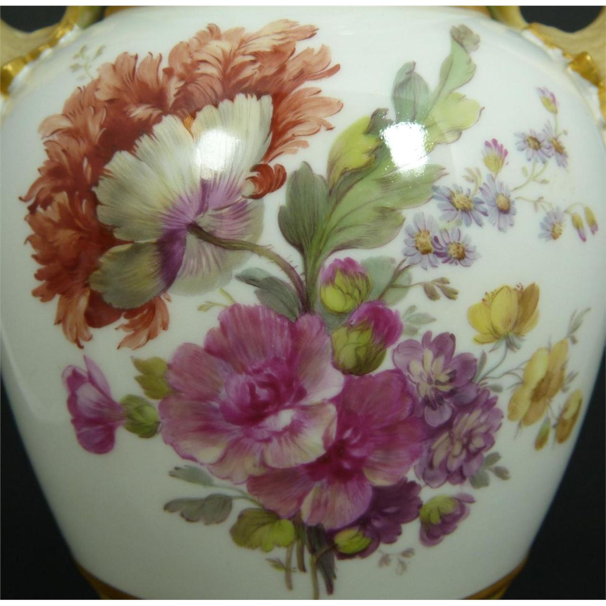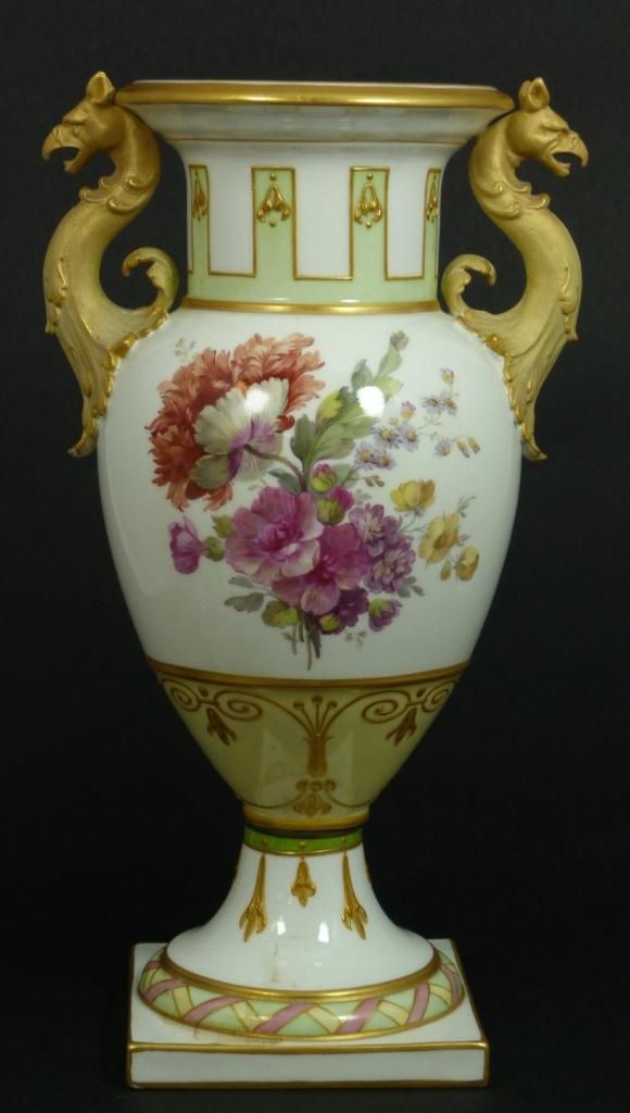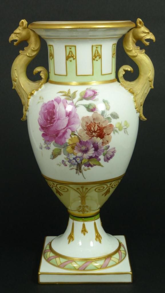 Antique Berlin KPM porcelain hand painted floral vase. Has a beautiful green, pink, ivory and gold design over white ground. Has floral bouquet to front and back of body. Has two gilded figural Griffin beast handles. Holds Blue scepter mark with red globus cruciger mark. 19th century. Holds incised 'W.A.O.' to bottom and numbered 20584. Measures 10 1/4" height (26cm). Total weight of 1044 grams.