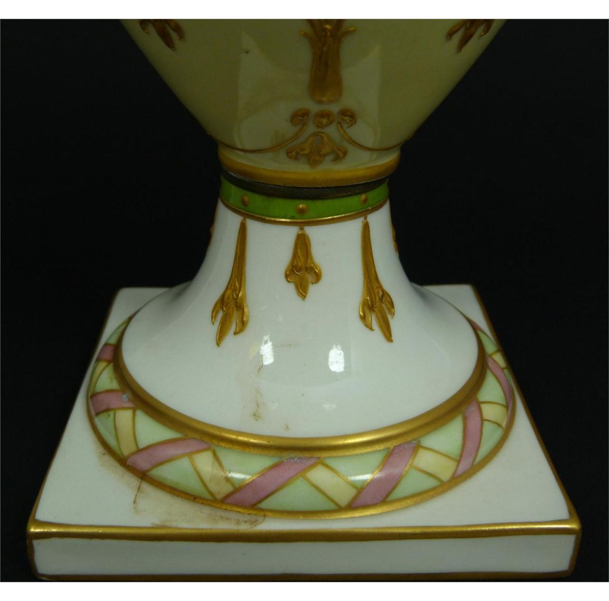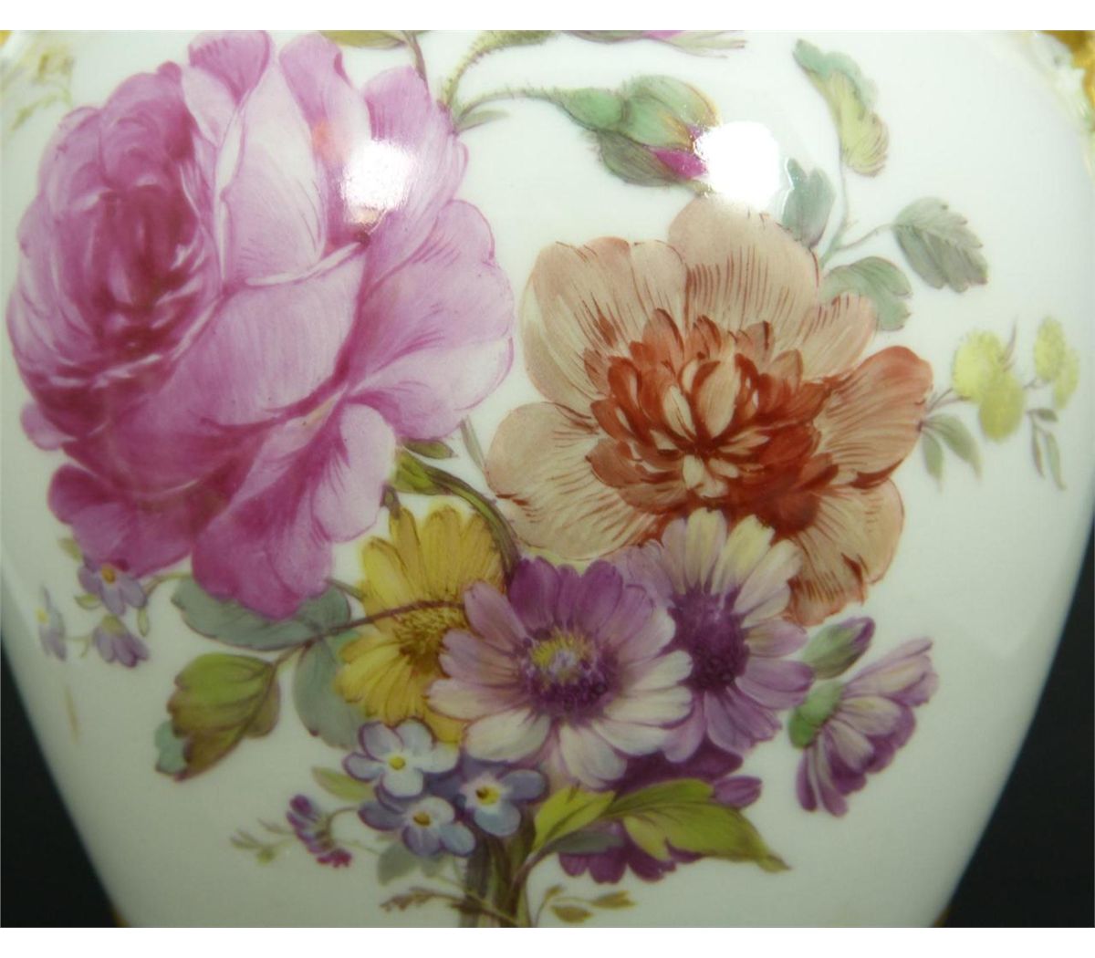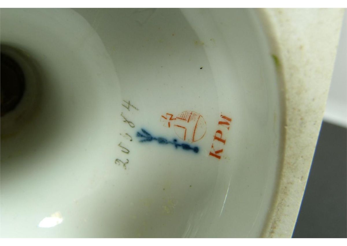 Antique Berlin KPM porcelain hand painted floral vase. Has a beautiful green, pink, ivory and gold design over white ground. Has floral bouquet to front and back of body. Has two gilded figural Griffin beast handles. Holds Blue scepter mark with red globus cruciger mark. 19th century. Holds incised 'W.A.O.' to bottom and numbered 20584. Measures 10 1/4" height (26cm). Total weight of 1044 grams.