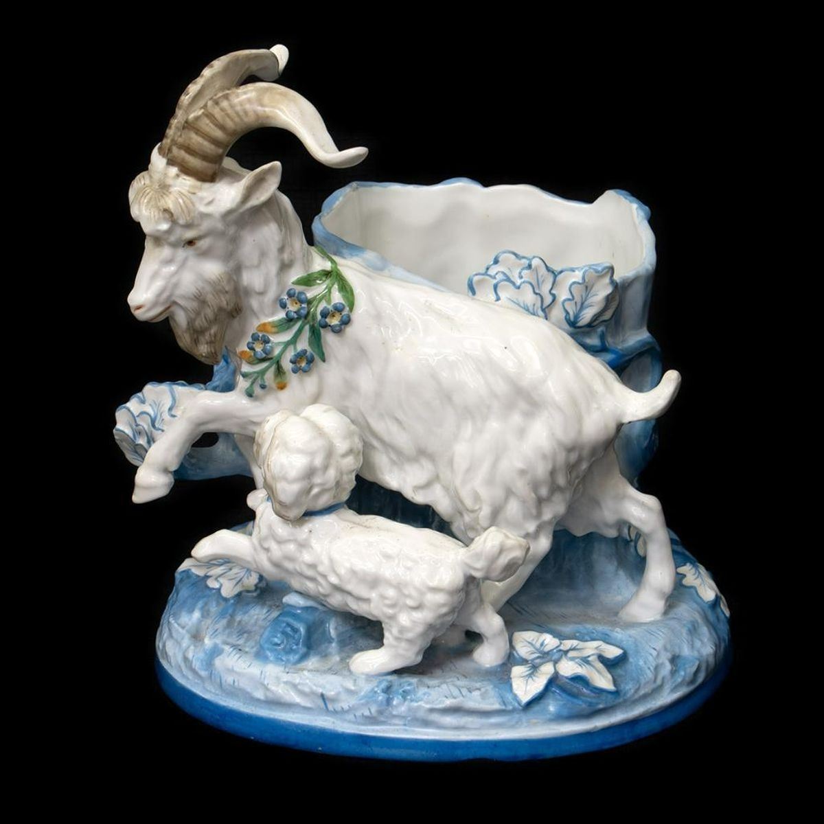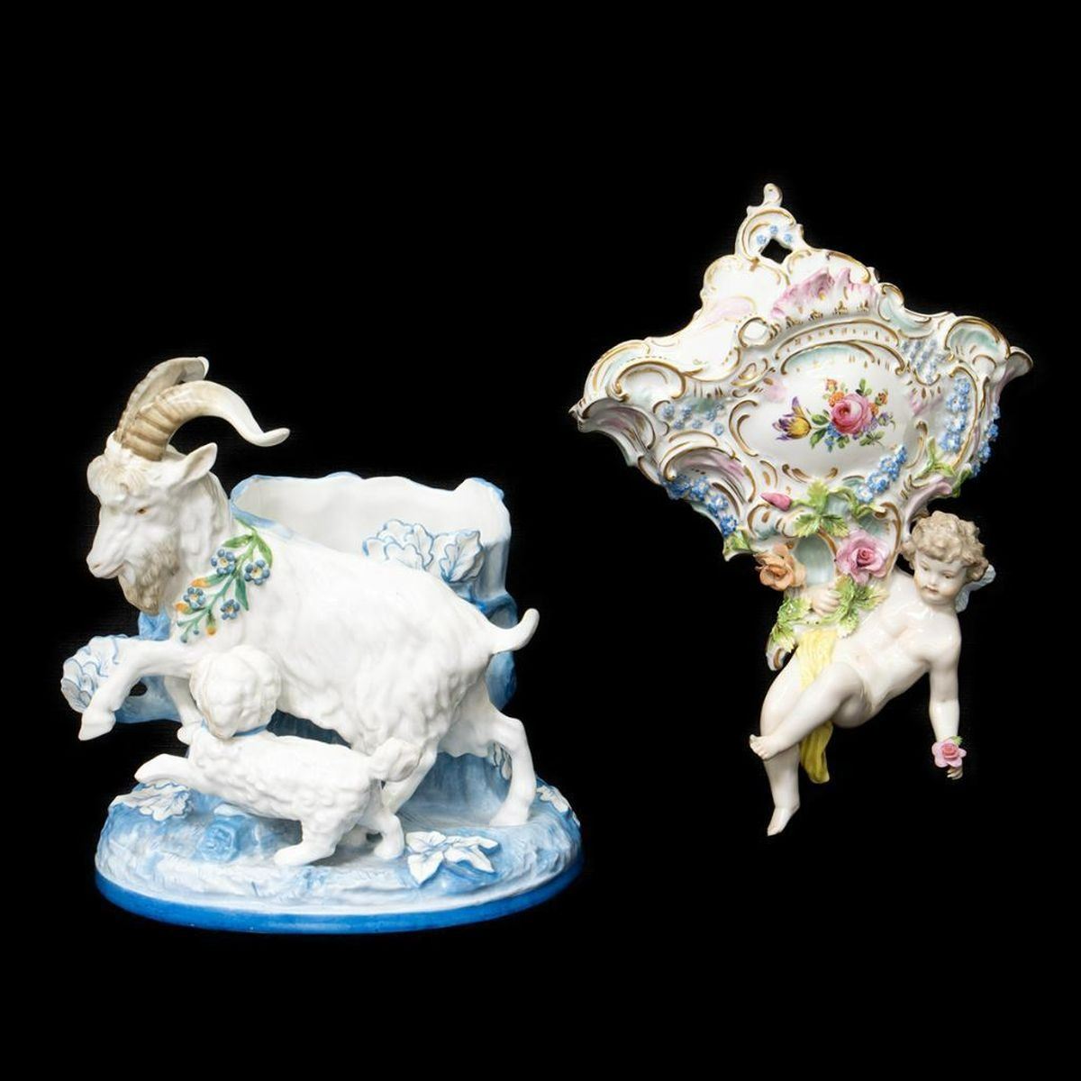 Depicting a playful group of a dog and goat with a tree trunk flower vase. 8in. h. Condition: Very good, no chips or cracks. Together with a Dresden Porcelain Wall Pocket. 10in. h. 7in. w. Condition: Very good, no chips or cracks.