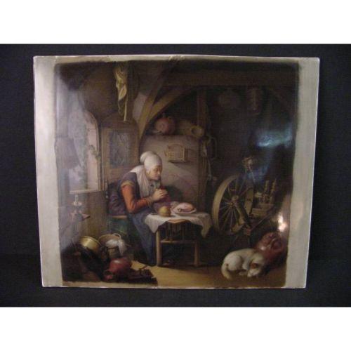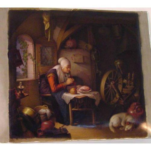 A peasant lady is seated in front of an arched leaded glass window with clutched hands giving thanks over her daily bread and fowl, a sleeping dog is at the foot of a spinning wheel and he is so well painted you can see the hair in the fur. This oil on porcelain plaque is so well done that you can see weaving in baskets, tarnish on brass pots, even shapes and staves of wooden buckets. The porcelain is also large, being 13 1/4" wide by 11 1/4" tall, there is an old if not original frame with the painting. The condition could not be better, no visible chips, cracks, flakes, its just in really good shape ready to use. Easily late 19th Century. The spinning wheel is so intact, even the yarn holder with white yarn is visible.