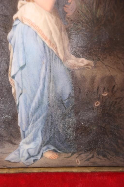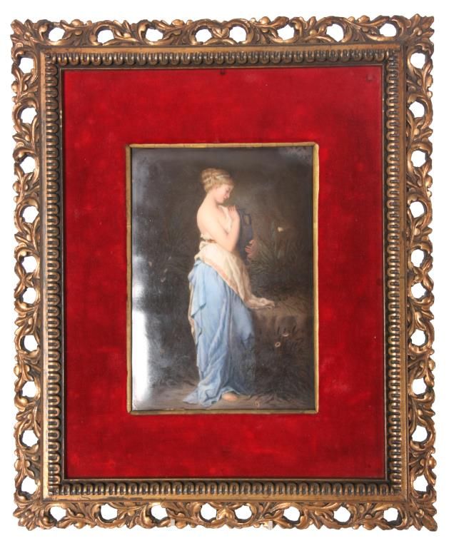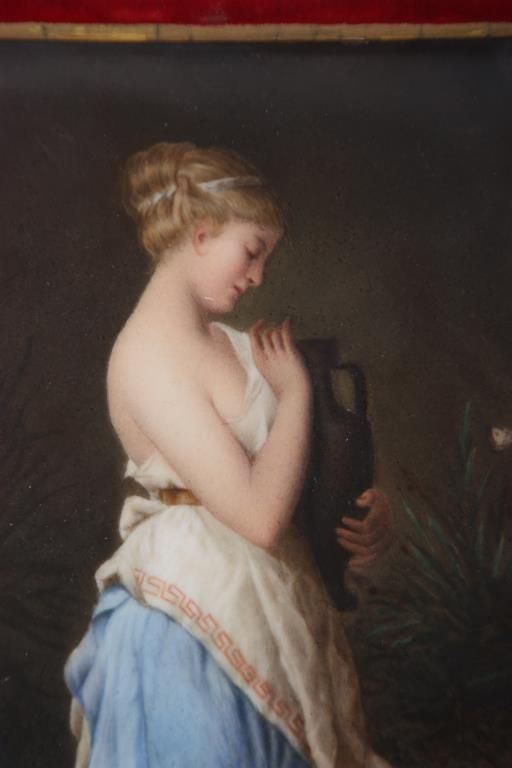 Hand painted porcelain plaque titled Psyche With Urn after the original work by Beyschlag; the woman stands in a forest holding an urn, various foliage surrounds her and a butterfly floats to the right. A beautiful scene in very good condition with no breaks, chips, cracks, repairs or inpainting; signed with KPM & scepter mark, 9 in. high x 6 in. wide.
