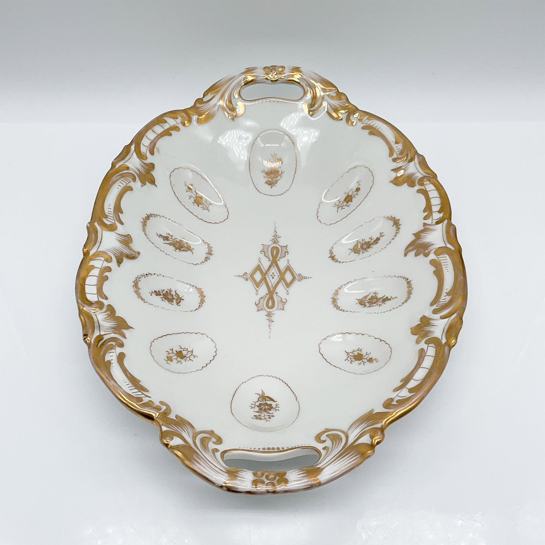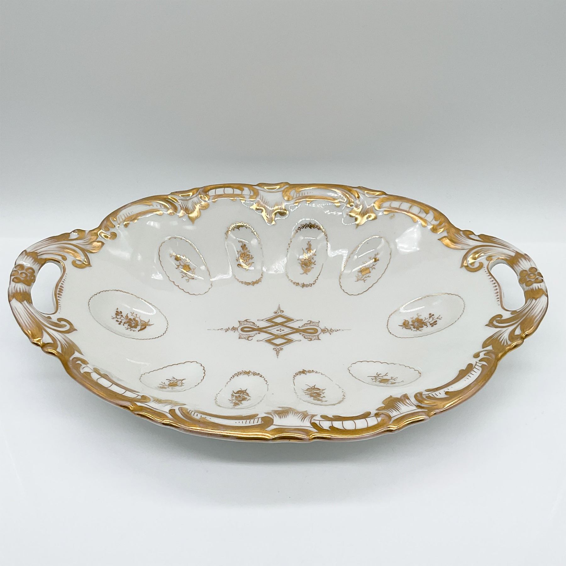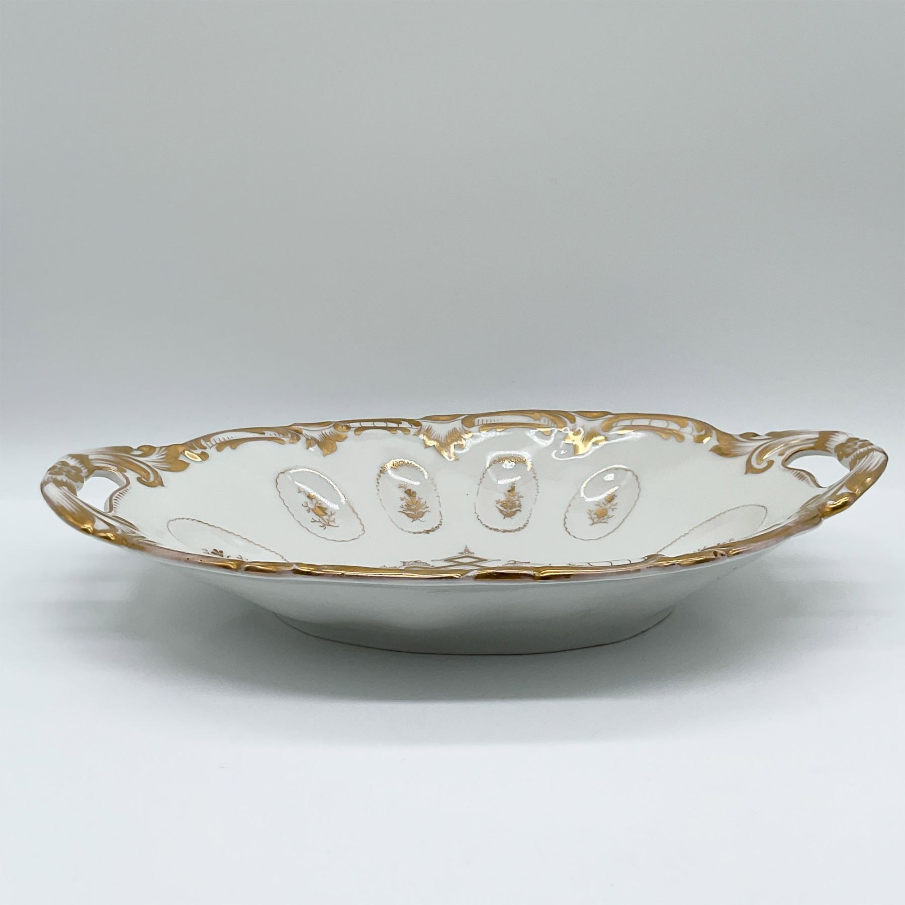 This elegant Krister Porzellan-Manufaktur porcelain serving bowl features an ornate design adorned with hand-painted gilded accents and floral motifs. The oval-shaped bowl includes open handles and a scalloped rim, showcasing intricate craftsmanship and classic German porcelain artistry. Marked with the Krister Porzellan-Manufaktur backstamp on the base. Measuring 12.75 inches in length, it is a versatile and timeless decorative piece.