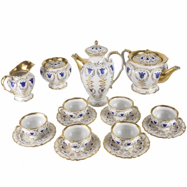 A mid 19th Century porcelain tea and coffee service set by Berlin KPM. The service includes a coffee pot, a tea pot, cream and sugar and six cups and saucers. Date marked for 1847-1851.