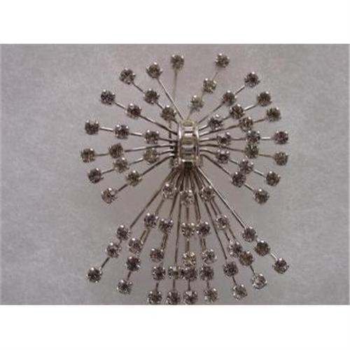 New York NY was chosen by Louis Kramer as home for Kramer Jewelry Creations in 1943. The company closed in 1970s. His brothers joined him in the company that almost overnight established a high rating in the jewelry industry for quality and design. In the 1950s, Kramer was responsible for all production of DIOR Jewelry in the USA. Their own work was signed Kramer of New York and featured both expensive and inexpensive costume jewelry lines. The 1960s gave women the opportunity to flaunt their diamonds in Kramer rhinestone creations as the Diamond look. This diamond look pin signed Kramer of New York is probably from the 1960s. It is in excellent condition. The pictures are not very good and I do not see any of the clear stones as being discolored. All clear rhinestones are original, intact, and all appear very sparkling to me. They are hand set and held firmly intact by 4 individual prongs. This brooch is in brand new condition. It is about 2 3/4 inches tall and about 2 inches wide. Please email me about questions and or offers.