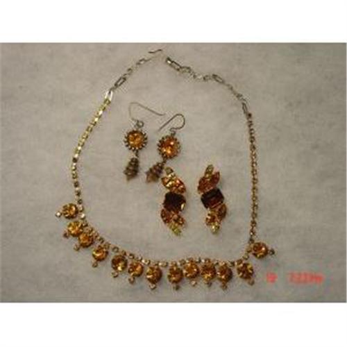 Here is a beautiful citrine orange colored rhinestone set. There is a necklace with different shapes of glass faceted hand placed stones. All stones are held firmly intact by individual prongs. This measures 15 1/2 inches long and is adjustible. Thre is a pair of pierced older style drop Egyptian style citrine earrings, there is a pair of different shades of citrines, smokey topaz rhinestones these clipped earrings are signed Kramer of NY. All items in excellent condition. I do not think this all came together in original set, but matches well and is in excellent condition