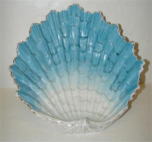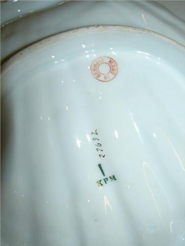 KRANICHFELD PORCELAIN FACTORY (1903+) BOWL. Blue decorated shell-form bowl is gilt decorated around rim. Marked on bottom “Made in Germany/KPM”. 2.75” H, 10.75” L