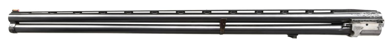Cal. 12 Ga., 2 3/4". S# 399. Bbls. 30" w/ .30" VR, Ithaca Raybar front sight, & mid bead. Bottom of bbl. has Ulm proof w/ "359" appearing to indicate March 1959 mfg. Fixed Full over Mod chokes. Bbl. marked "CUSTOM BUILT TO THE ORDER OF L.M. DONALDSON MIAMI, U.S.A. / BY HEINRICH KRIEGHOFF K.G. ULM / DONAU, GERMANY - BOHLER SPECIAL BARREL STEEL". Breech section of top bbl. & bbl. band at muzzle have scroll engraving. CONDITION: very good to near excellent blue w/ light disassembly wear. (02-19801-1/MD). $300-500.