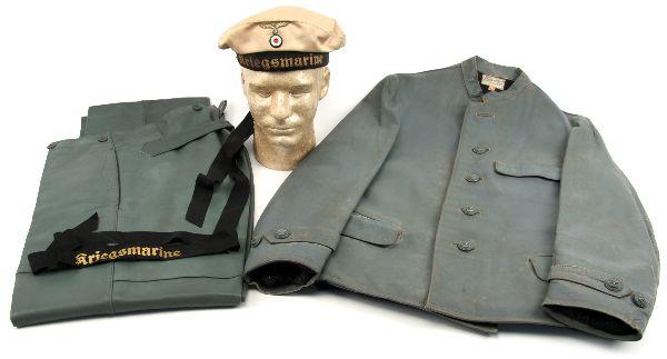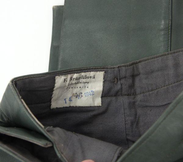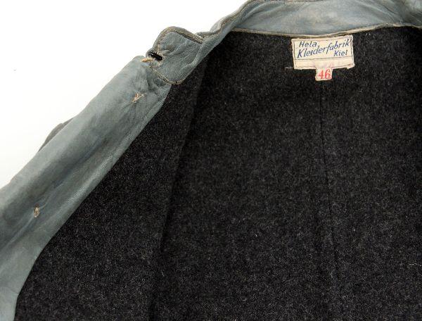 A well preserved original grey leather U-Boat Crew members Jacket and Trousers, hat with extra talley. The jacket is a private purchase "Hela Kleiderfabrik Kiel" Euro size 46. Grey wool lining free of mothing. The trousers are a separate maker "F. Brazdilova Lederbekleidung Prosnitz" Euro size 46 and a 1942 date, the condition is very good to near excellent.