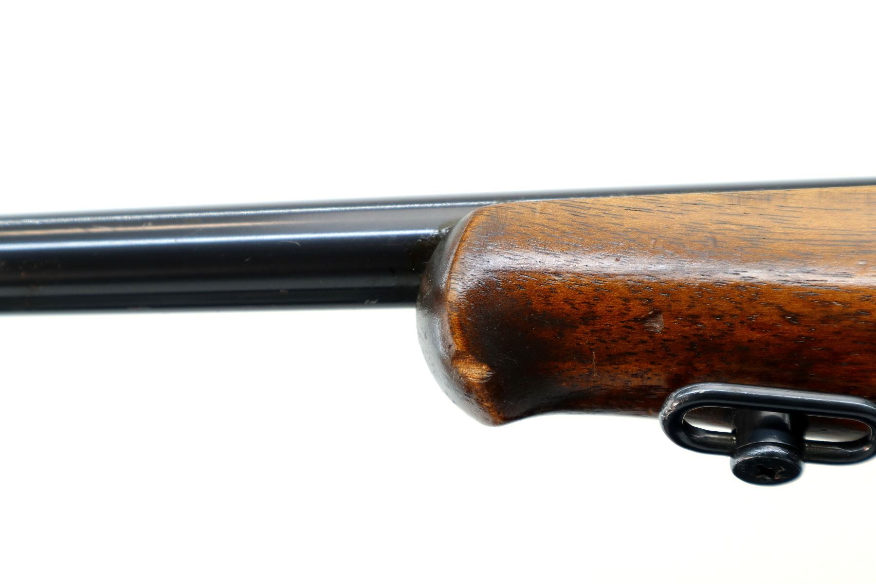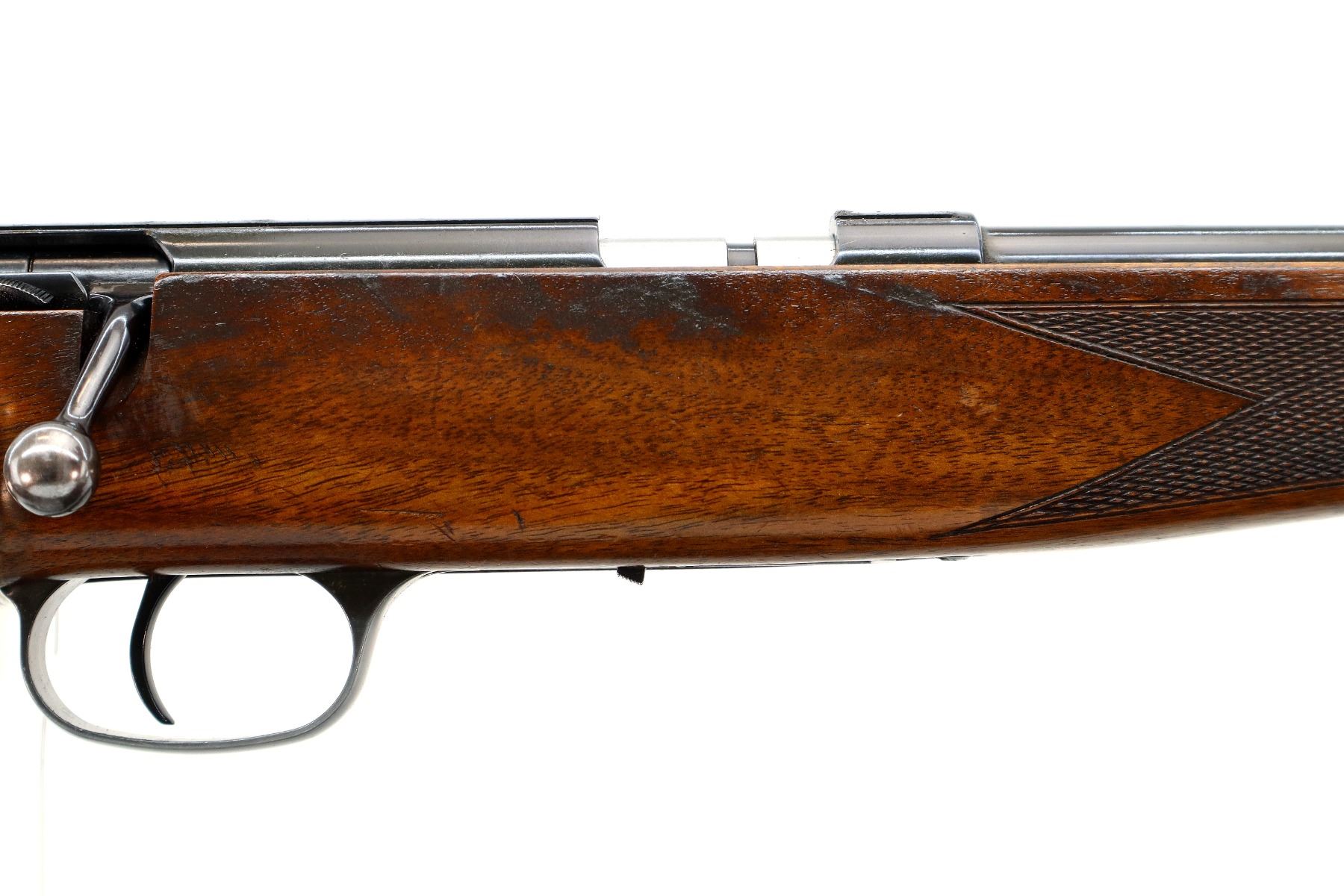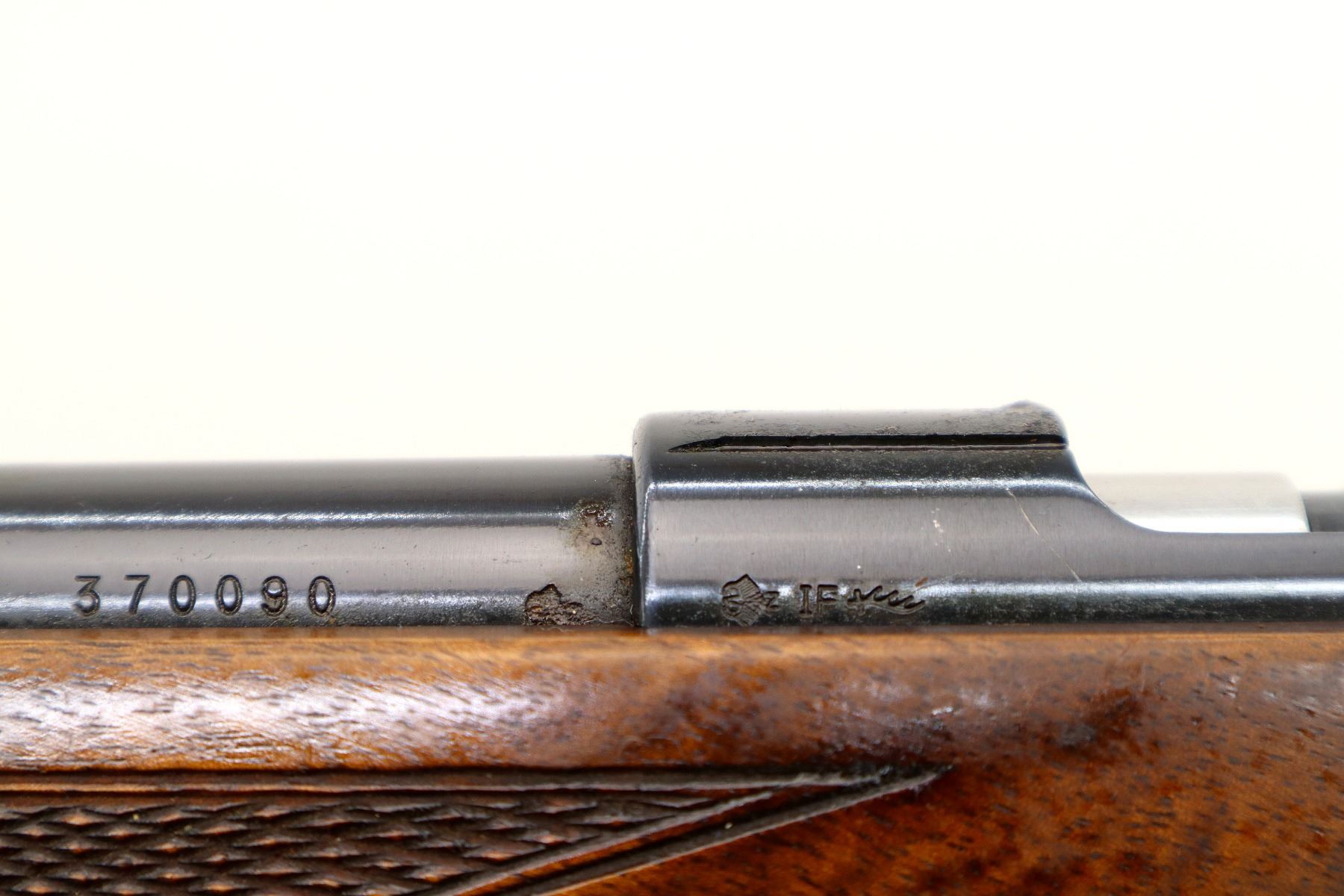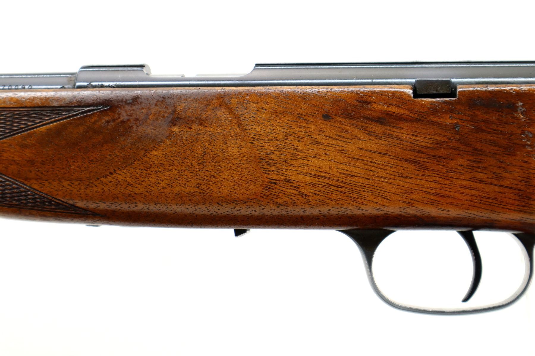 Main Description: Missing front and rear sights, threaded holes are present, blued finish, grooved receiver, smooth bolt knob. One piece wood stock, Schnabel forend tip which is chipped, checkered forearm and pistol grip with right hand palm swell, cheek rest, grooved black polymer butt plate, 14" LOP, sling swivels.