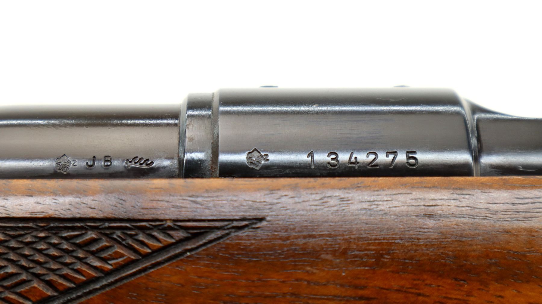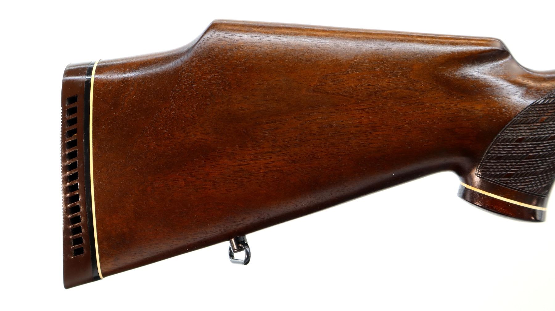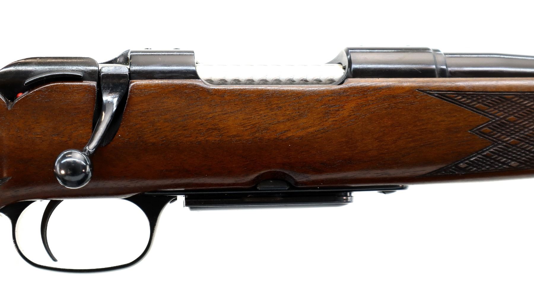 Main Description: Blade front sight with ramp, adjustable u notched rear sight with ramp, polish blued finish, receiver drilled and tapped with plug screws installed, jeweled bolt with smooth knob. One piece Satin finish wood stock, Rosewood forend and pistol grip caps, checkered forearm and pistol grip with right hand palm swell, cheek rest, brown vented rubber recoil pad, sling swivels.
