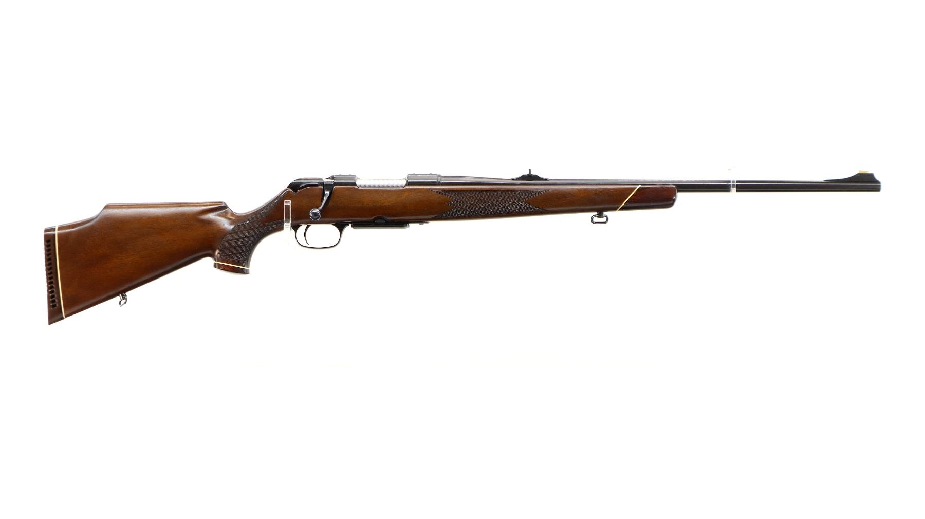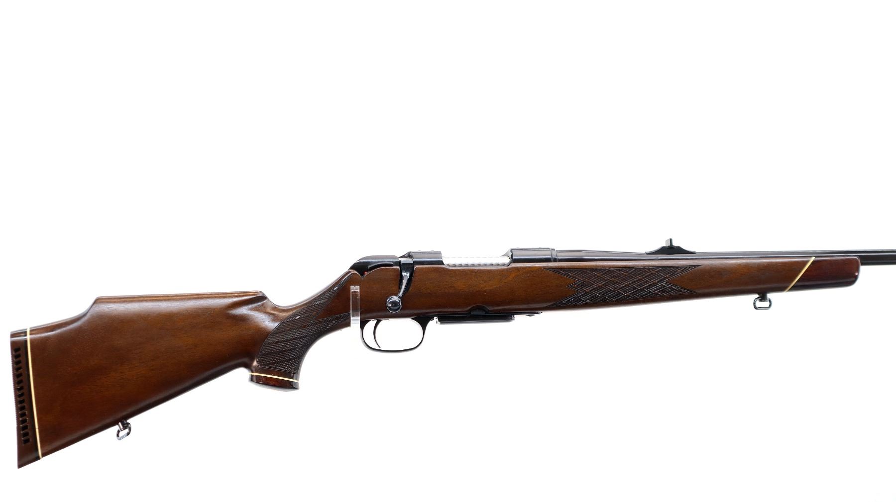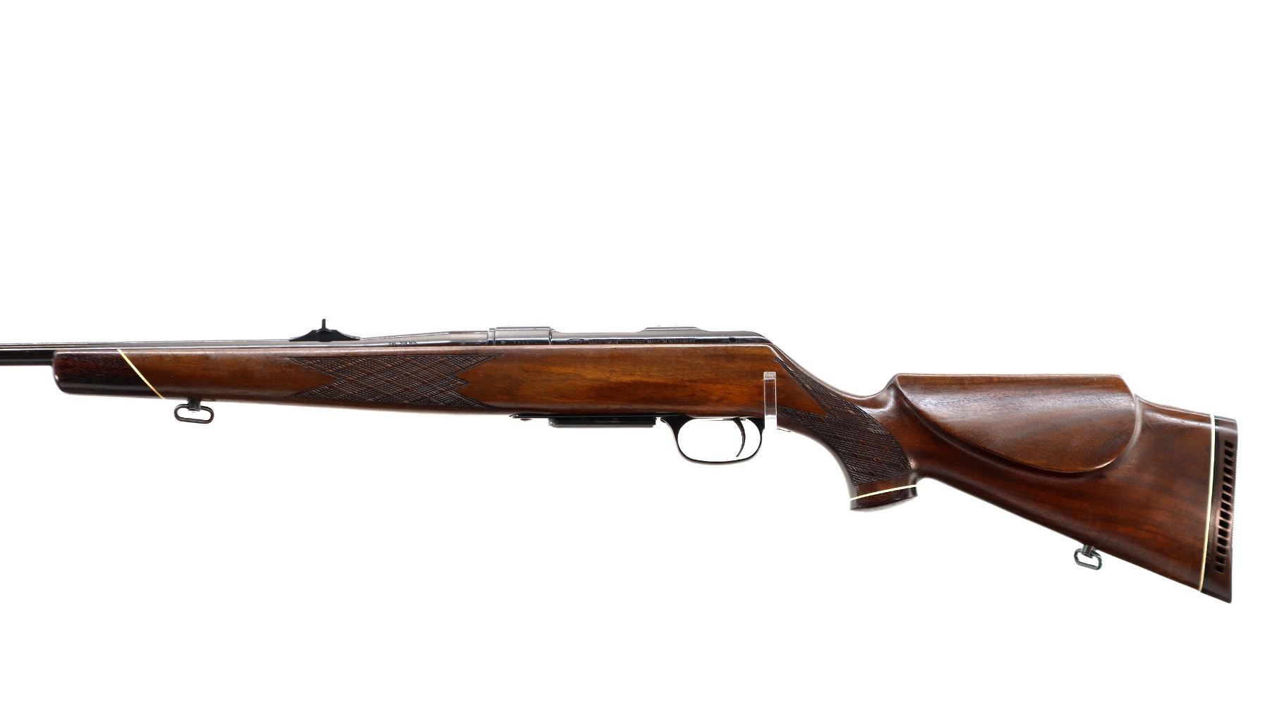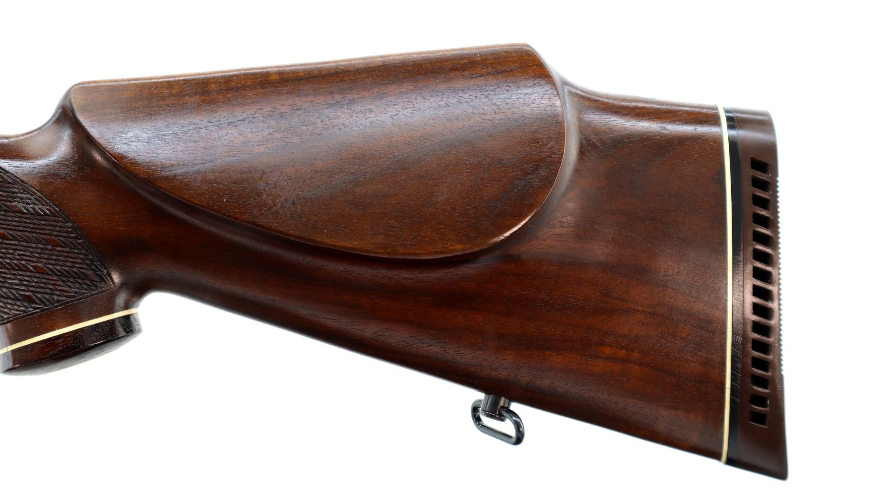 Main Description: Blade front sight with ramp, adjustable u notched rear sight with ramp, polish blued finish, receiver drilled and tapped with plug screws installed, jeweled bolt with smooth knob. One piece Satin finish wood stock, Rosewood forend and pistol grip caps, checkered forearm and pistol grip with right hand palm swell, cheek rest, brown vented rubber recoil pad, sling swivels.
