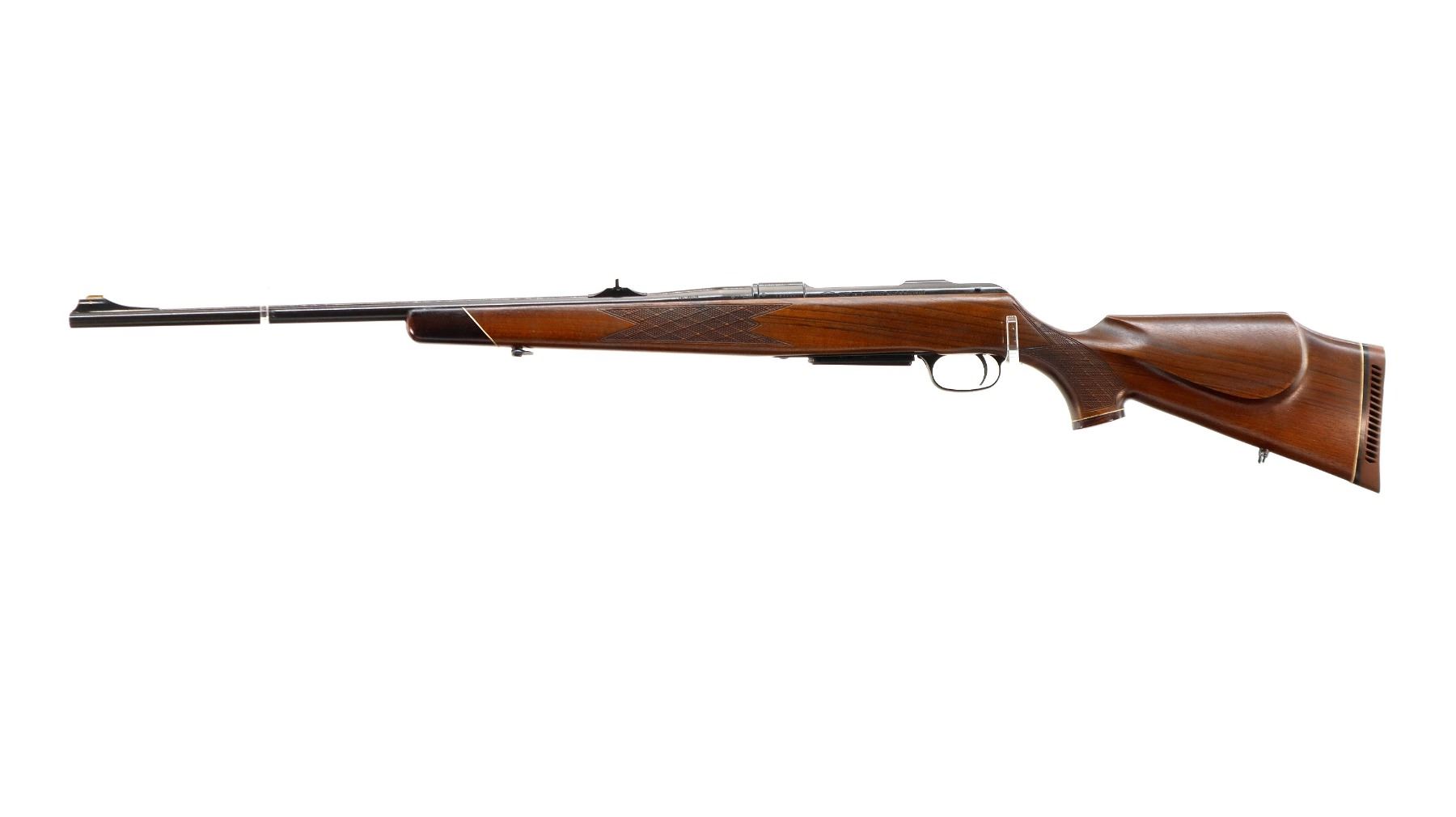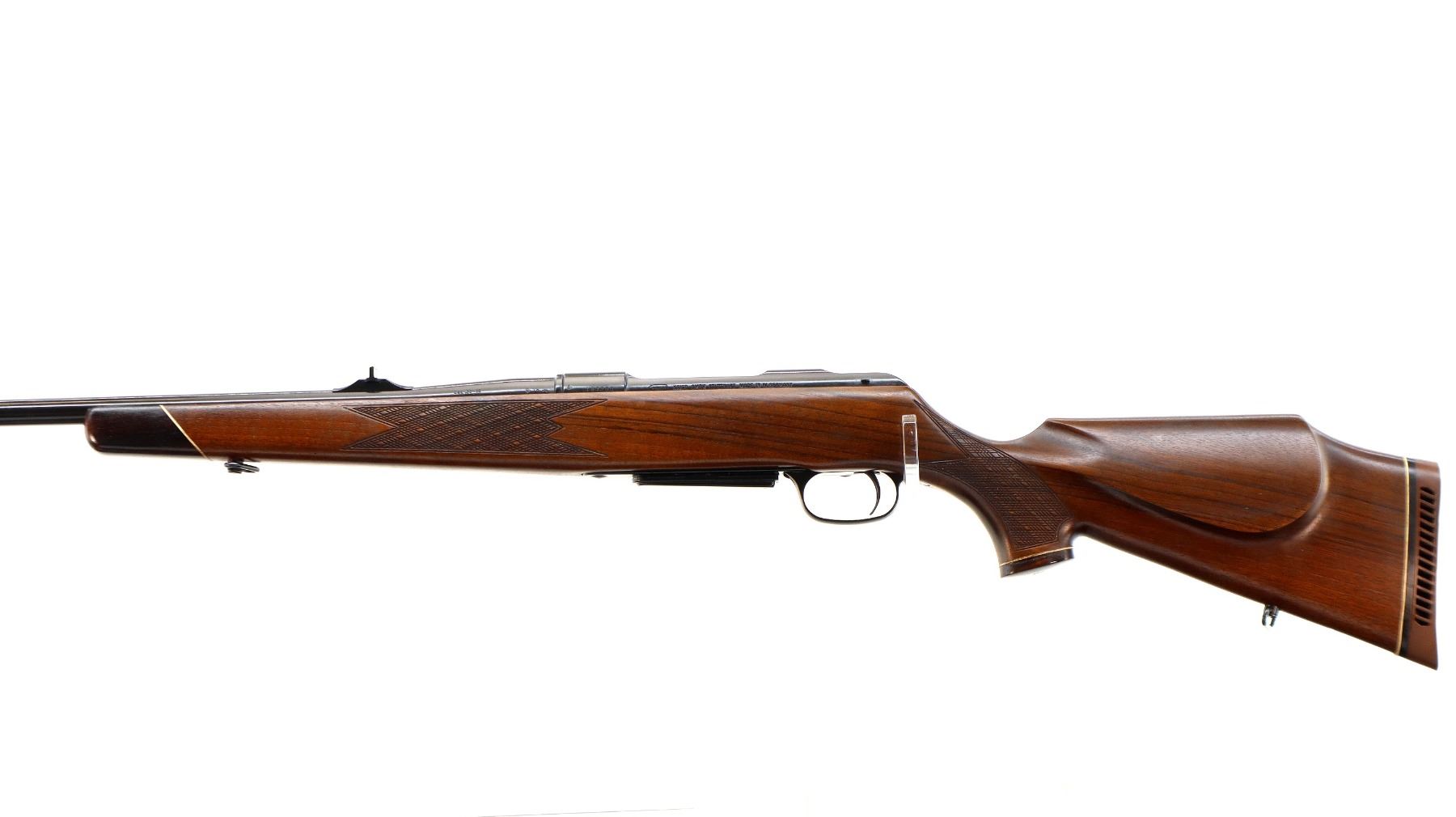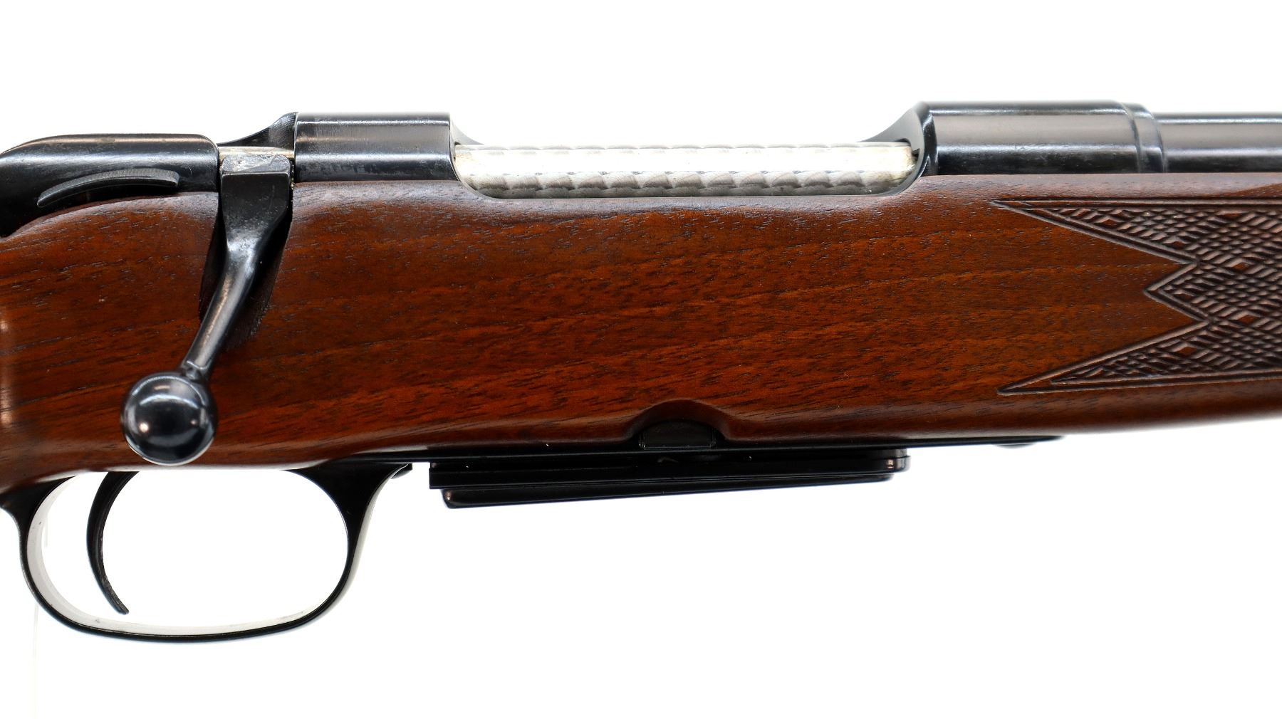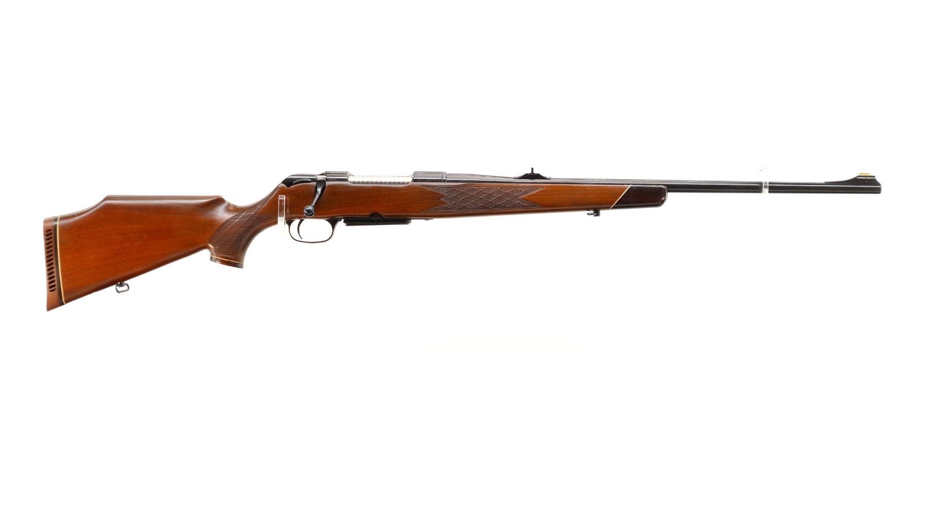 Main Description: Blade front sight with ramp, adjustable u notched rear sight with ramp, polish blued finish, receiver drilled and tapped with plug screws installed, jeweled bolt with smooth knob. One piece Satin finish wood stock, Rosewood forend and pistol grip caps, checkered forearm and pistol grip with right hand palm swell, cheek rest, brown vented rubber recoil pad, sling swivels.