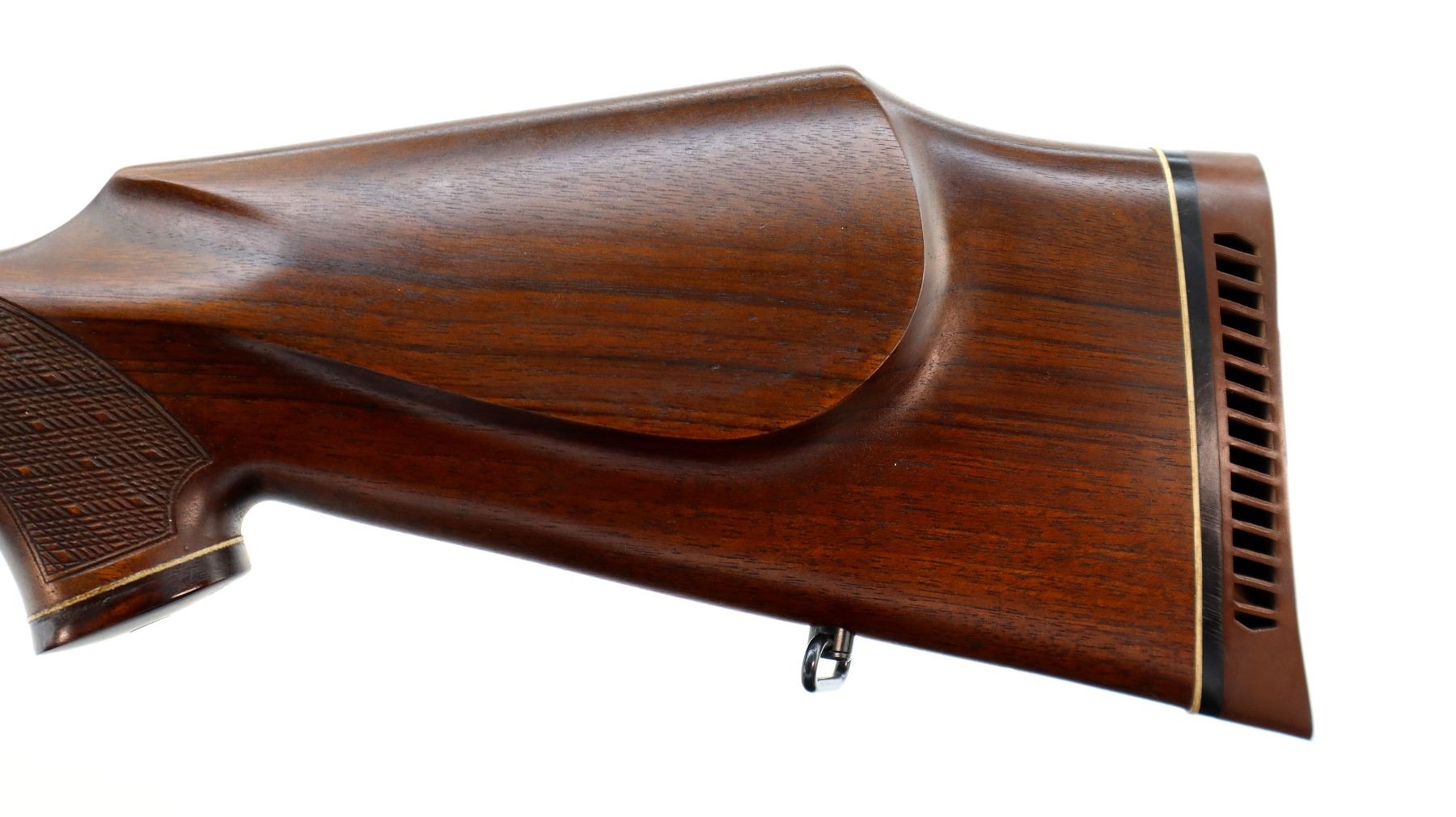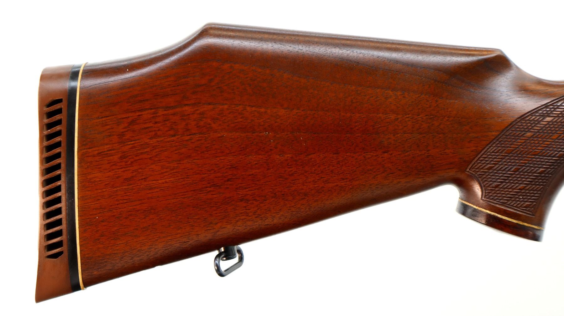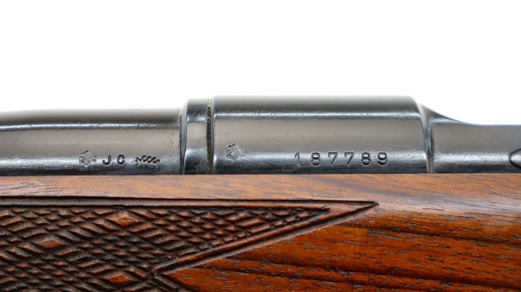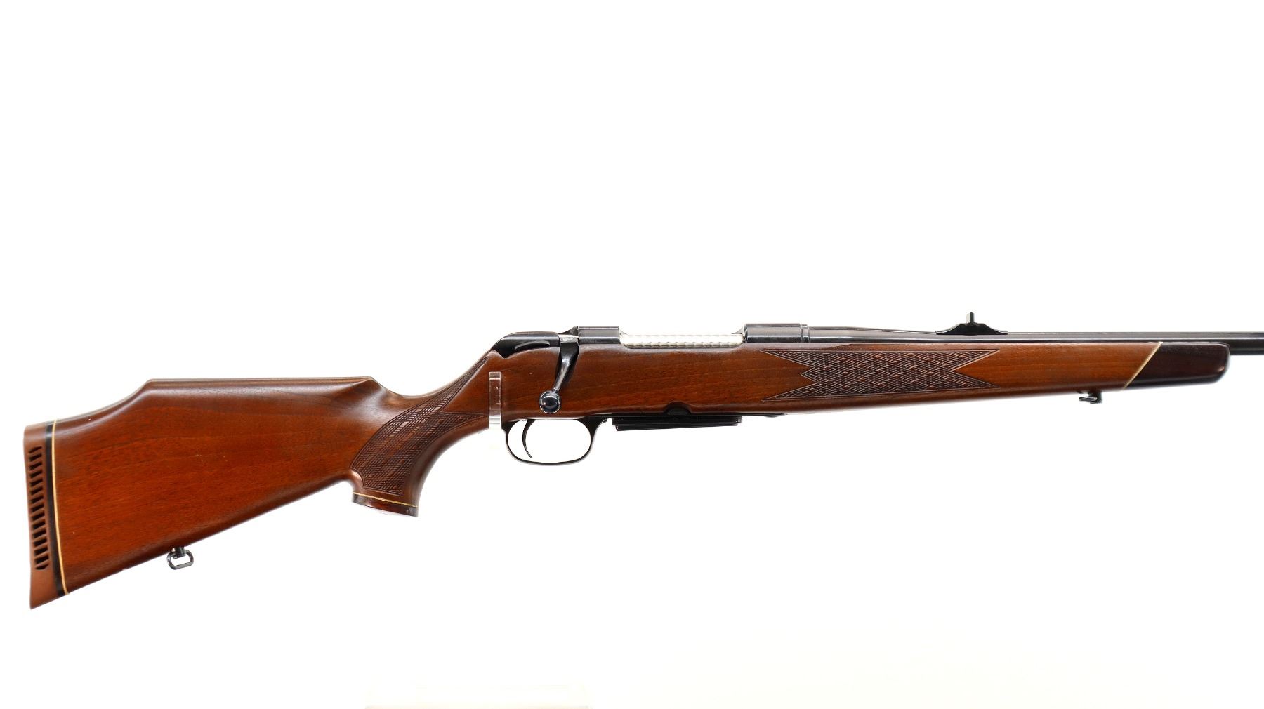 Main Description: Blade front sight with ramp, adjustable u notched rear sight with ramp, polish blued finish, receiver drilled and tapped with plug screws installed, jeweled bolt with smooth knob. One piece Satin finish wood stock, Rosewood forend and pistol grip caps, checkered forearm and pistol grip with right hand palm swell, cheek rest, brown vented rubber recoil pad, sling swivels.