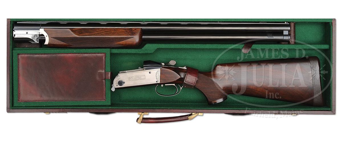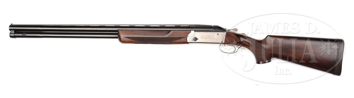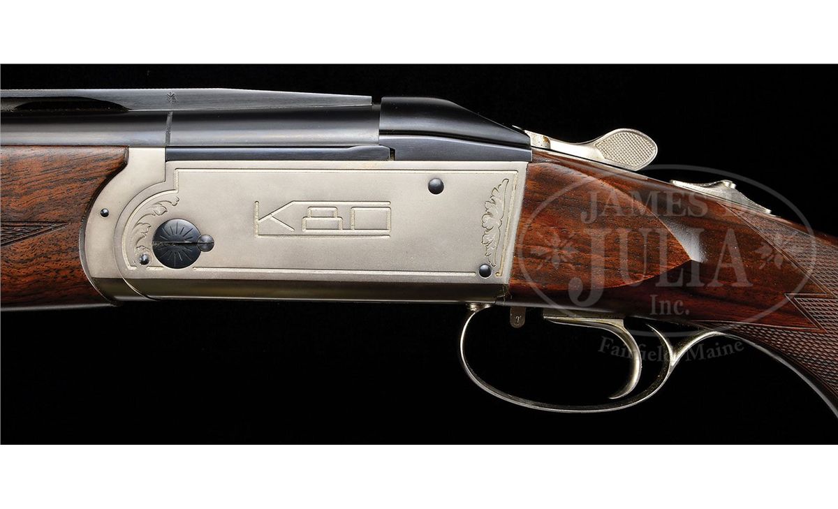 SN 14159. Cal. 12 ga. 2-3/4" Chambers. 28" Bbls with 12mm wide, matted, ventilated rib and ported bottom bbl, are marked "BOHLER - LAUFSTAHL" and "MADE BY H. KRIEGHOFF ULM - GERMANY" on left side of top bbl. Coin finished action with non-automatic safety and single selective trigger is marked "K80" on sides and "H Krieghoff Gmbh Ulm W-Germany" on bottom. There are sprays of scroll framing markings. Nicely marbled European walnut full ebony capped pistol grip buttstock measures 14-7/8" over brown leather covered pad, and features right hand palm swell, and point pattern checkering with line borders. Matching one piece full beavertail forend has Deeley type release. Drop at heel: 2", drop at comb: 1-3/8". Weight: 8 lbs. 8 oz. LOP: 14-7/8". Makers high quality reddish brown leather case with green canvas outer cover, and two brass combination locks, is lined in green felt, with brown leather "Shotguns of Ulm" label in lid, forming pocket holding Krieghoff instruction booklet. CONDITION: Excellent, near new, showing evidence of very little use, with light cartridge halos on breechface, which barely begin to obscure damascening, with only a few extremely light scratches and marks in all orig finishes. Mechanically crisp. Case is excellent. Straps and handle are good. Zippers of outer cover work. Interior has some marks and rubs. 4-49186 MGM262