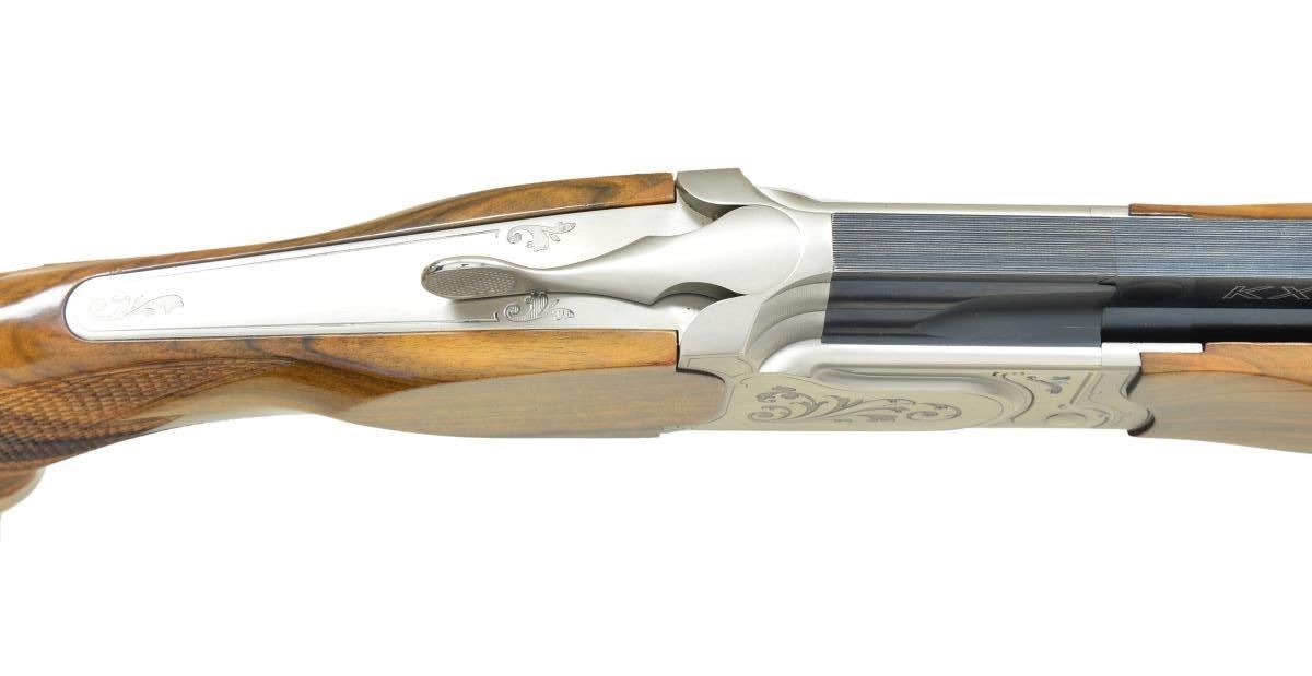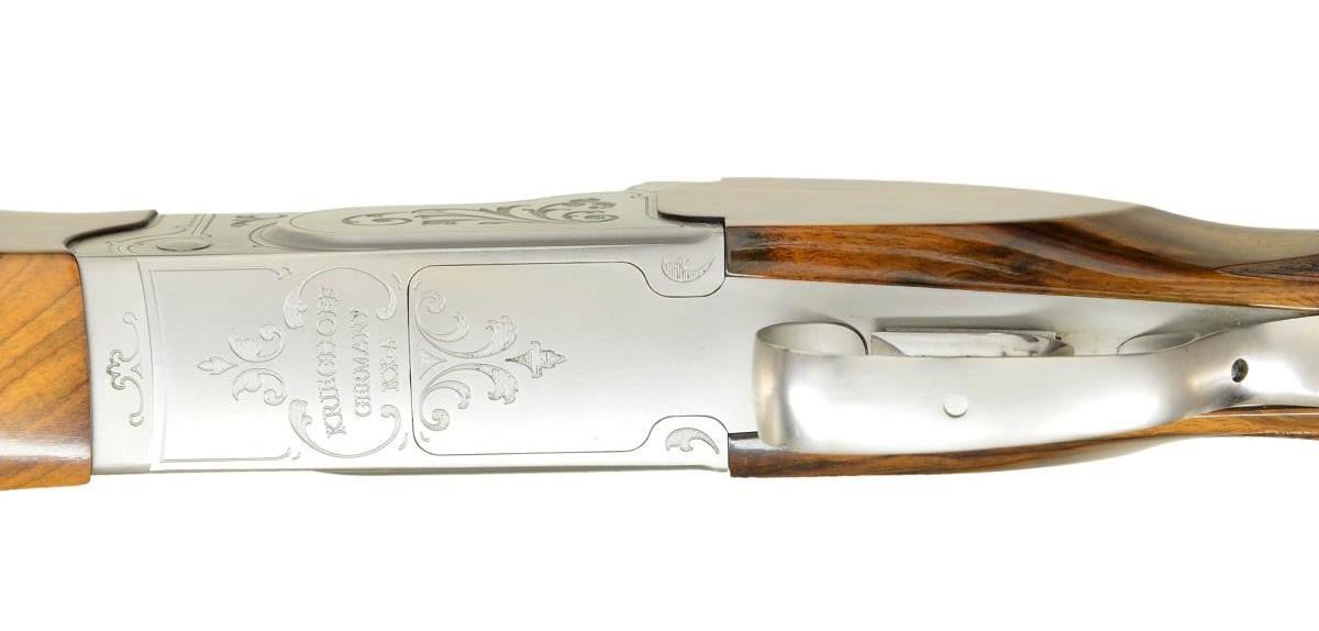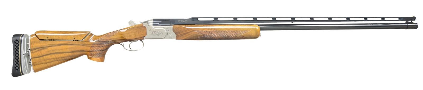 Cal. 12 Ga. 2 3/4". S# 020782. The 34" ported monobloc bbl. is fitted with choke tubes & high ventilated rib adj. for point of impact. Both sides of rear portion of rib are marked "KX-5". Serial number & Ulm proofs are on bottom of monobloc. Coin finished trigger plate type action has no safety & is fitted with factory release single trigger with blade adj. for position. Sides of action have some open scroll engraving & bottom of action is marked "KRIEGHOFF" "GERMANY" "KX-5". Ambidextrous pistol grip stock of well figured & lightly streaked European walnut features adj. recoil absorbing buttplate by Pachmayr & adj. comb. Bottom of stock is marked with release trigger warning. Point pattern checkering is at grip. Matching beavertail type forend has Anson release. WEIGHT: 9 lb. 3 oz. UNATTACHED ACCESSORIES: gun is housed in aluminum Americase marked "Krieghoff". Interior is lined in blue velvet with "Krieghoff, a tradition of performance" embroided in gold in lid. Case contains 2 choke tubes, stock tool, various allen wrenches & instruction manual. CONDITION: very fine. Gun showing very little use except for some assembly marks and a few minor marks & dings in all exterior finishes. Most notably, a hardened drop of oil on left side of forend. Case is fine with some marks on exterior. Interior cloth shows some compressions. Combination lock does not work. (22-2114/MGM). MODERN. $5,000-7,500.