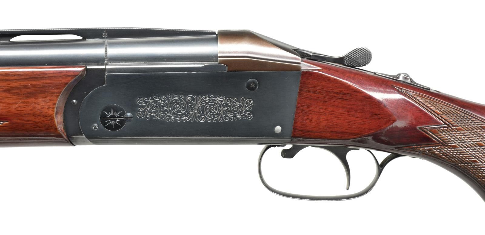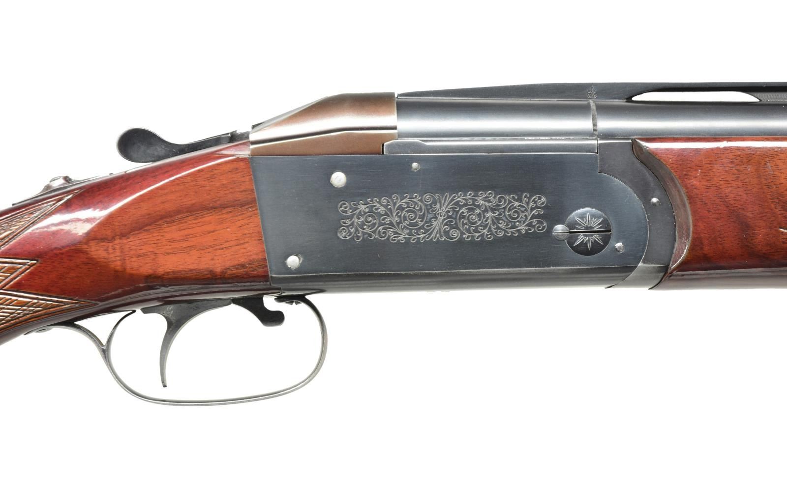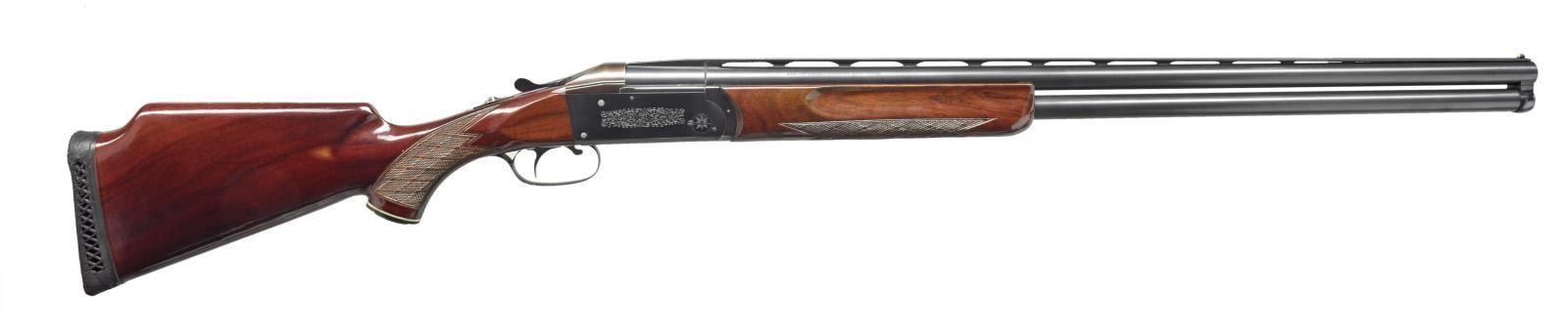 Cal. 12 Ga. S# 4448. Bbl. 30" monoblock w/ slightly raised ventilated rib marked for I-Mod & Full chokes. Bottom of monoblock stamped w/ 1969 German nitro proofs. Blued Model 32 action has blocked safety & single selective trigger. Sides of action engraved w/ open scroll & bottom marked “KRIEGHOFF” & “MODEL 32”. Capped pistol grip Monte Carlo buttstock of European walnut measures 14 1/4" over old black "Krieghoff" pad. Skip line checkering is at grip. Matching target forend has Deeley type release. DAH: 2 1/4". Drop at rear of Monte Carlo: 1 5/16". DAC: 1 5/16". WEIGHT: 8 lbs., 3 oz. UNATTACHED ACCESSORIES: "John Hall" plastic case lined in brown fuzzy faux fur. CONDITION: very fine, retaining over 95% original finish on bbl. Action has about 85% blue w/ hand wear & silvering around bottom. Stocks retain nearly all what appears to be original heavy reddish varnish which is lightly crazed. Pad is shrinking & petrified. Very fine bores. Mechanically fine. (21-1432/MGM). CURIO. $3,000-5,000.