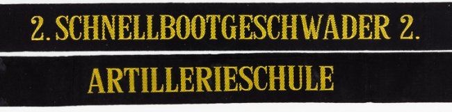 Pair of scarce Kriegsmarine cap tallies, apparently unissued, both BeVo-type embroidery. Includes a tally reading: "2. SCHNELLBOOTGESCHWADER 2." and the second reading: "ARTILLERIESCHULE". Both fine. Provenance: TIME-LIFE Collection, The War Museum.