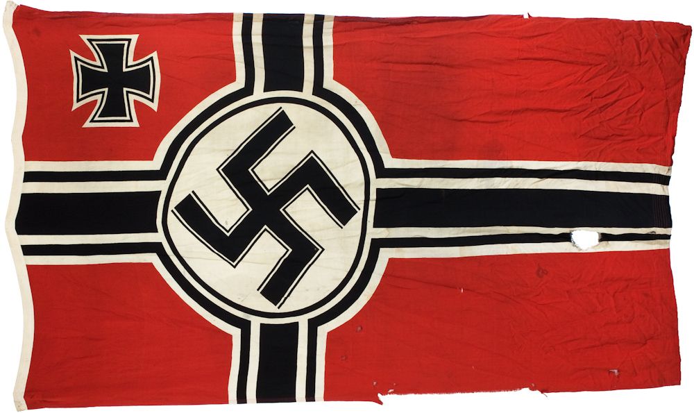 German World War II Kriegsmarine battle flag, 119" x 74 1/4" (220 x 335cm), a printed design with reinforced hoist, stenciled along the hoist with maker's name: "Fahnen-Kreisel" and "Reichskriegfl." with dimensions, eagle, and "M" denoting naval use. The flag bears some loss along an edge and several holes in the body, most noticeable a 5" circular hole which seems entirely inconsistent with typical insect, rodent, or mechanical damage, leaving battle damage a possibility. Some stains here and there - a really genuine item.
