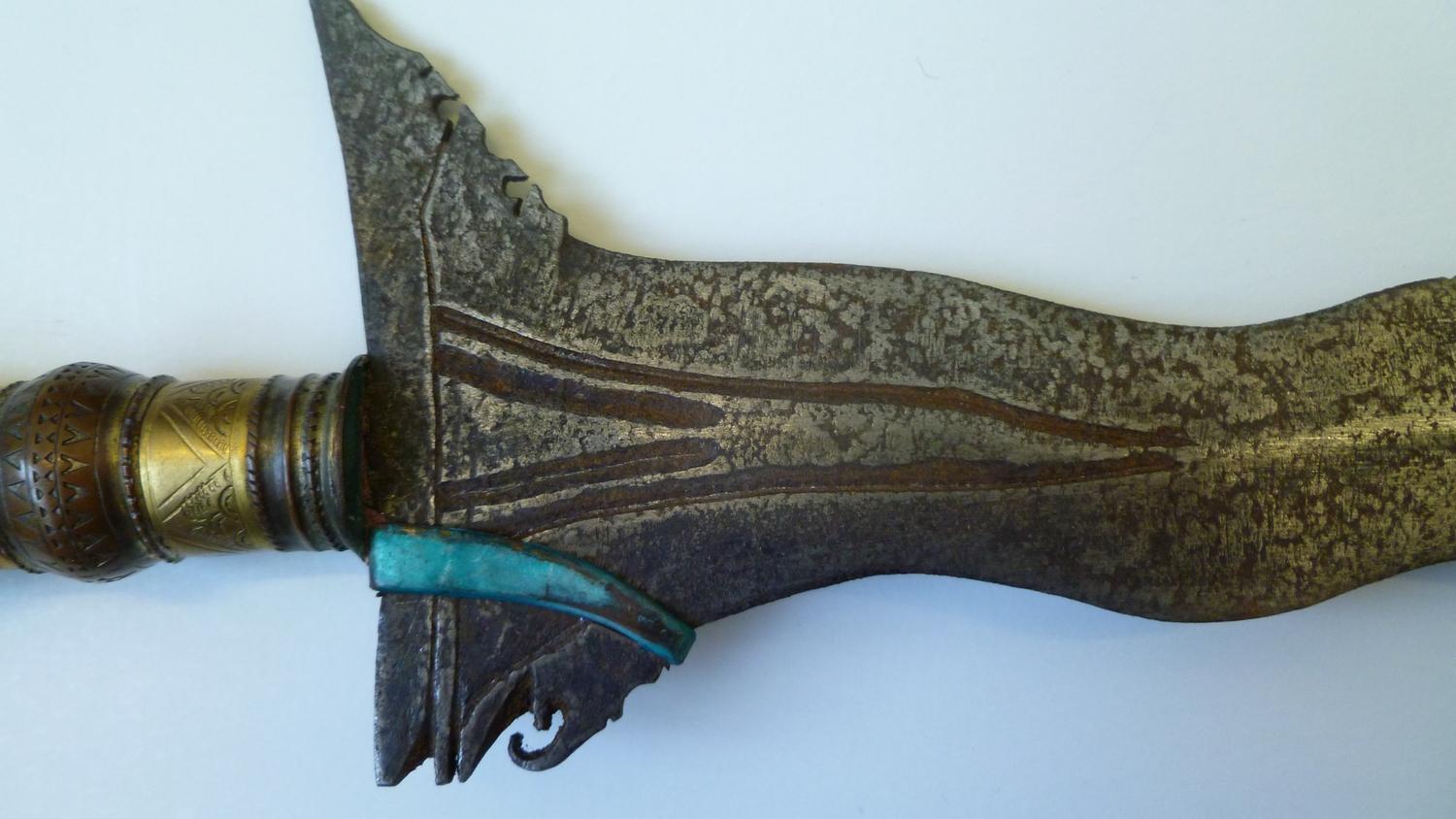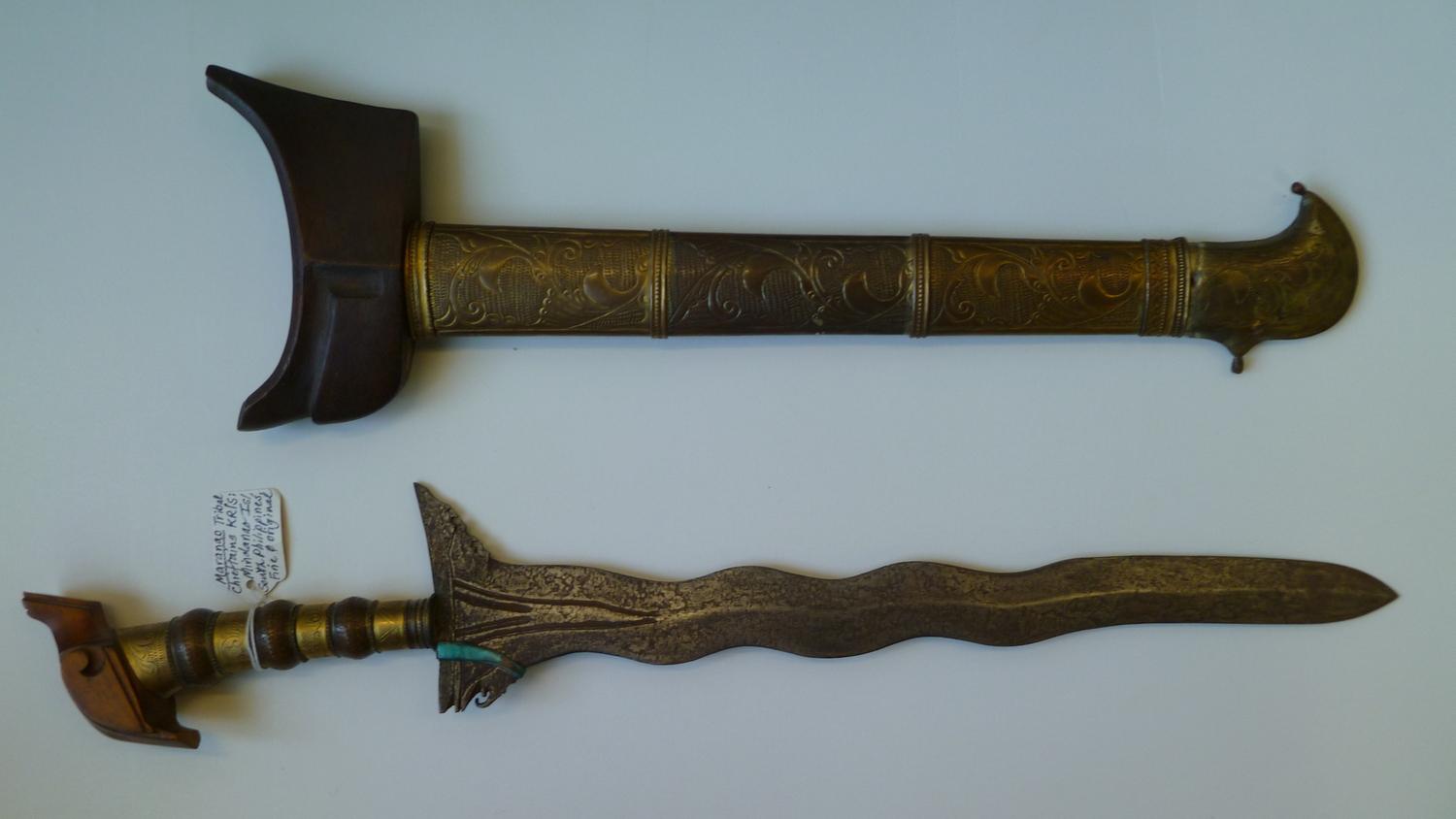 Philippines Tribal Chieftains personal Kris side-sword, with superbly made handle, blade & well-fitting two-tone metallic scabbard. Maranao peoples from Southern Mindanao island, 19th or early 20th C. and having light wear which is most evident in the silvering at the base region. Only flaw is that the outer metal scabbard details are a bit loose from age and shrinking of the wood frame beneath. Lovely display piece having a highly-desirable Kris blade that used meteoritic Iron in its making. Best quality overall of this fine artifact type. 21-1/4" long when closed and similar to the one pictured on page 174 of the UCLA Museum of Cultural History catalog titled "The People and Art of the Philippines"....and from the 1990s exhibition there.
