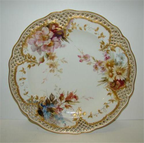KRISTER PORCELAIN MANUFACTORY PORCELAIN PLATE. Hand painted floral & gilt decorated. Laced border. Marked on reverse. 9.75" Dia.