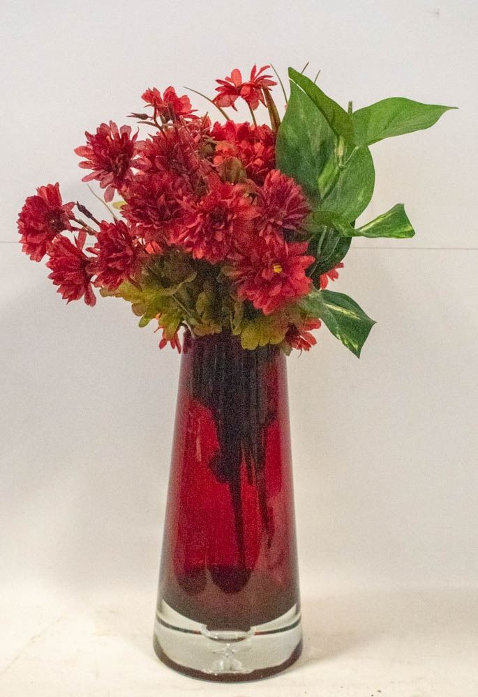 KROSNO RED VASE W/BUBBLE BASE+DECORATIVE FLOWERS